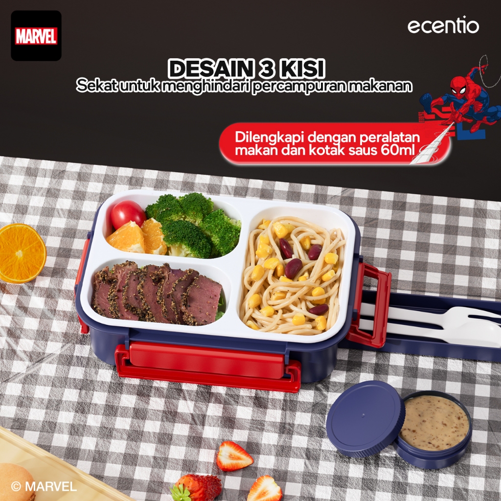Ecentio Marvel Edition Lunch Box Set Food Grade Material Tempat Bekal Set Anak Sekolah 3 Sekat 800Ml Kot
