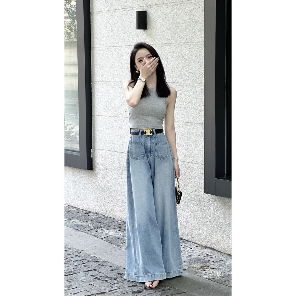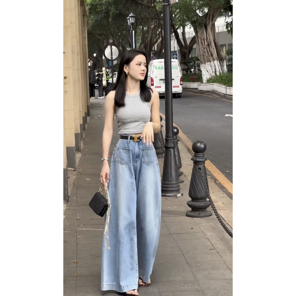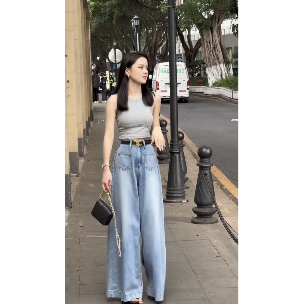 Jeans Pinggang Tinggi Kaki Lebar Wanita Katun Denim