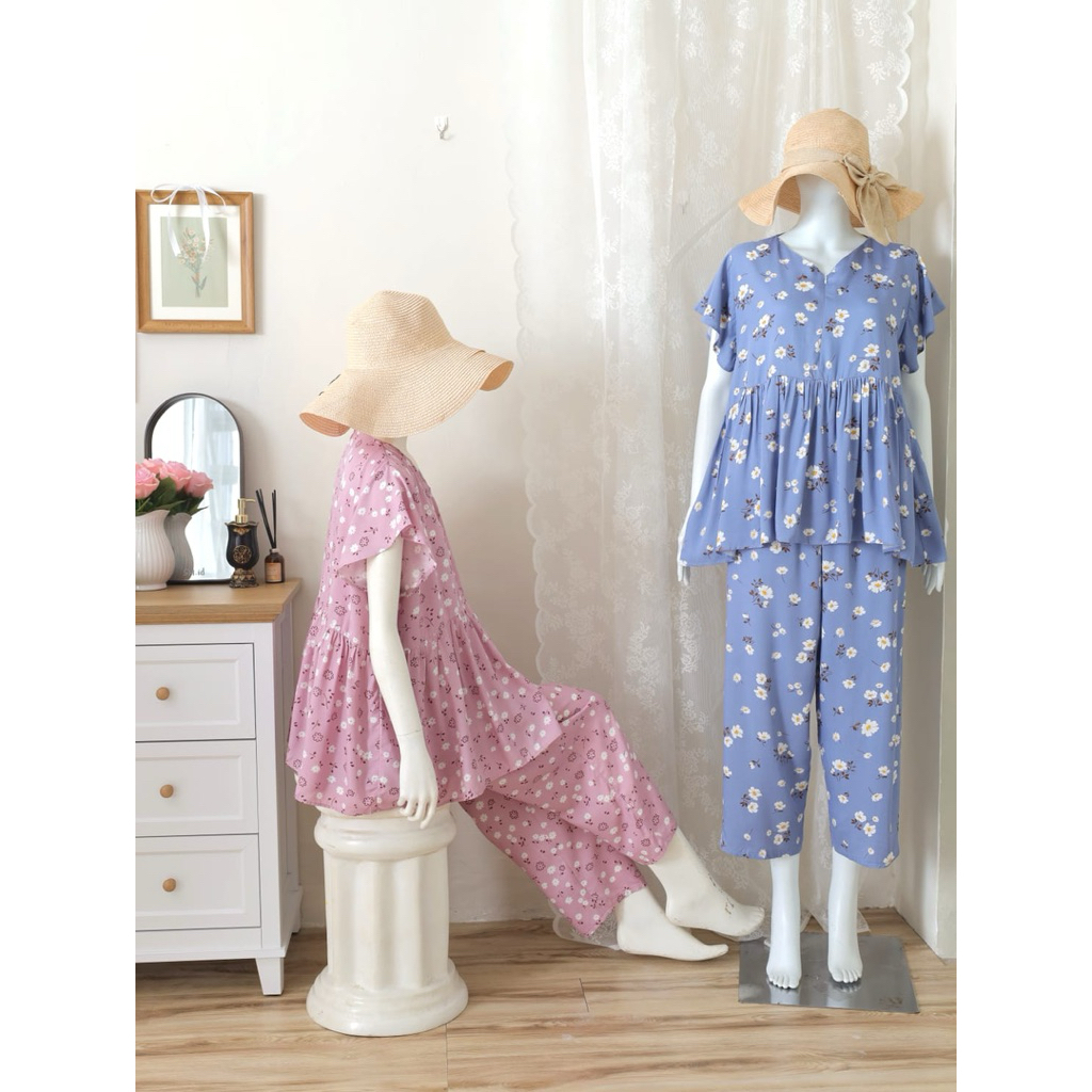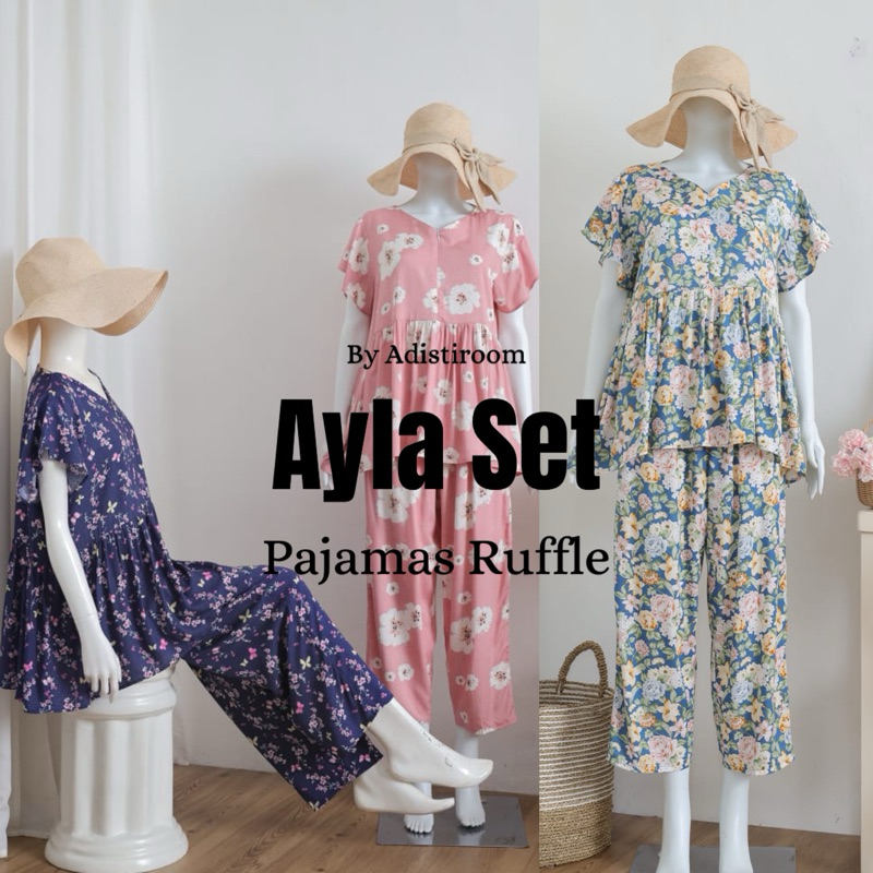 Ayla Setelan Piyama Rayon Busui Lengan Pendek celana panjang | piyama babydoll busui bumil friendly | piyama ruffle safu