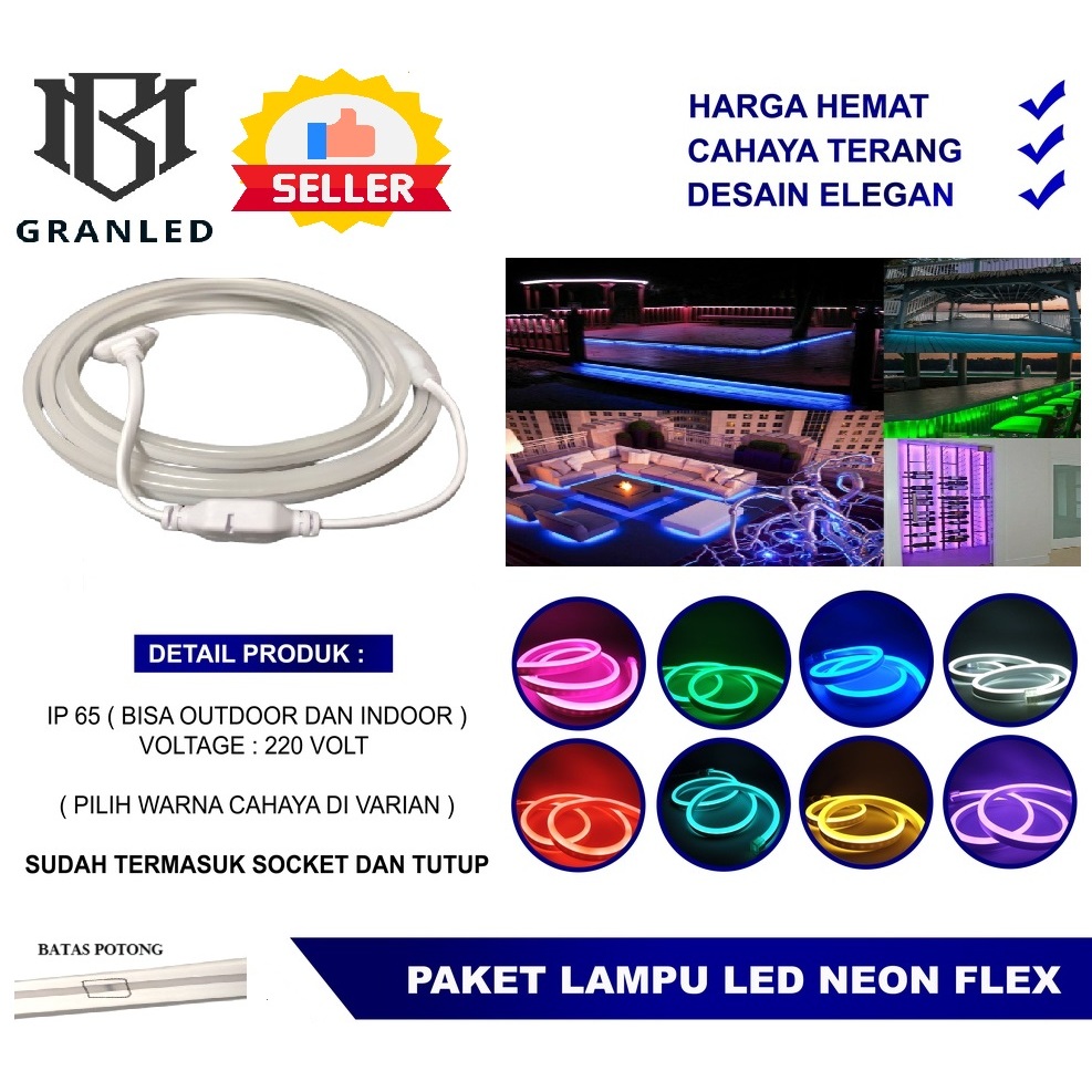 Paket Lampu Neon Flex 220V 5M 10M 15M 20M 30M+ Soket + Adator + Tutup / Siap Pakai Led Selang Fleksibel 220V Warna Neon