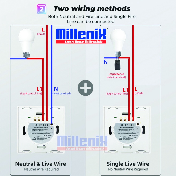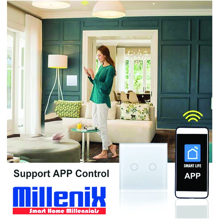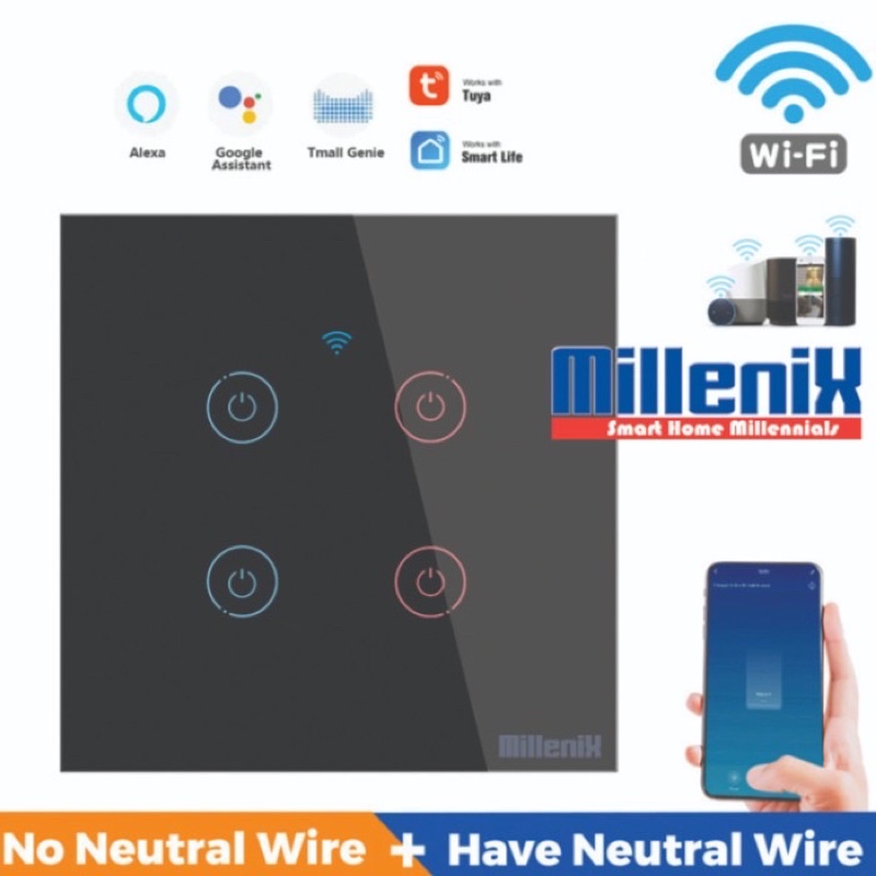Millenix Smart Switch Wifi Dual Mode (No Neutral + Neutral) Wall Touch Screen 1/2/3/4 Gang