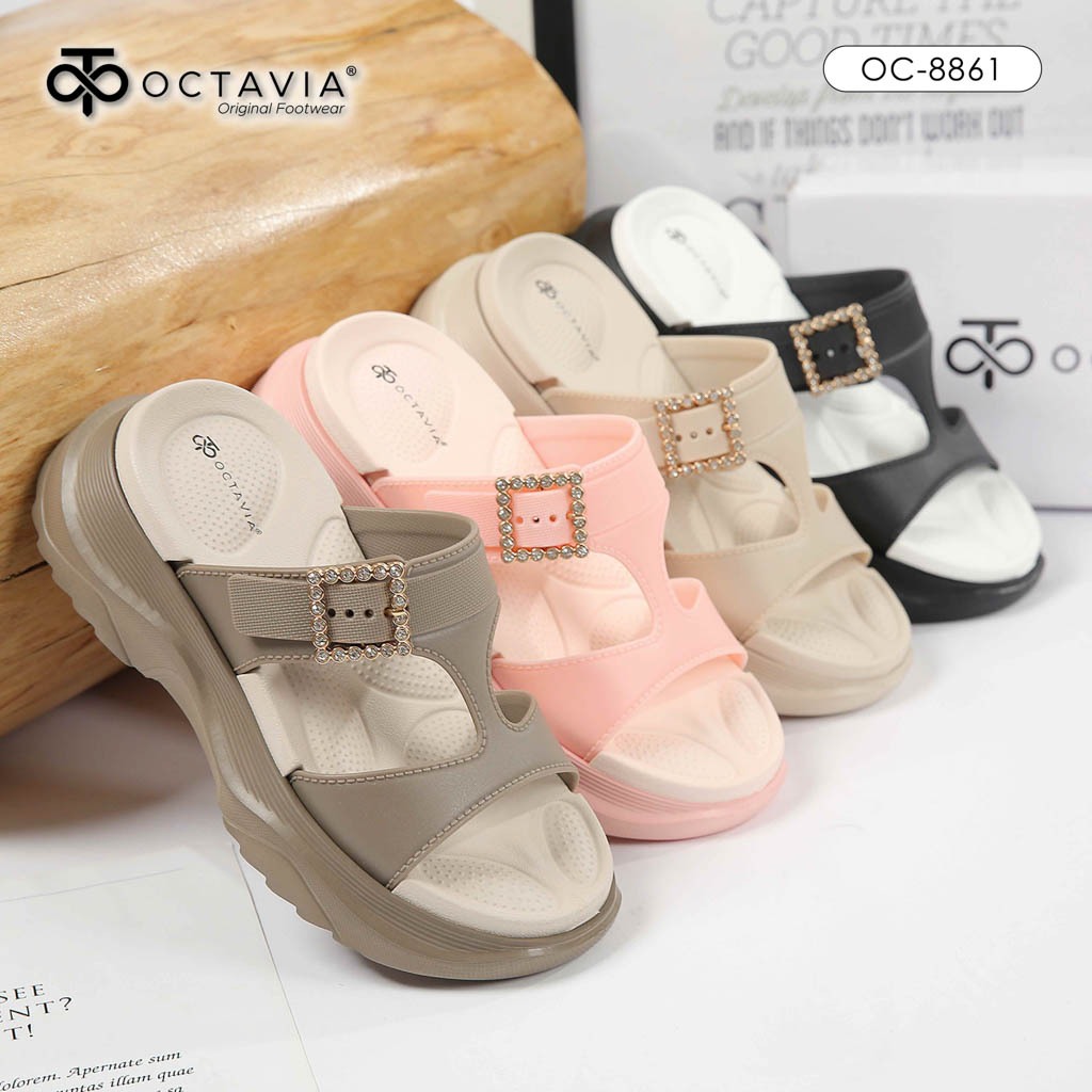 Octavia Sandal Slide Slip On Wedges Wanita With Diamond Beads Gesper #Oc-8861 (Free Box) - Beige