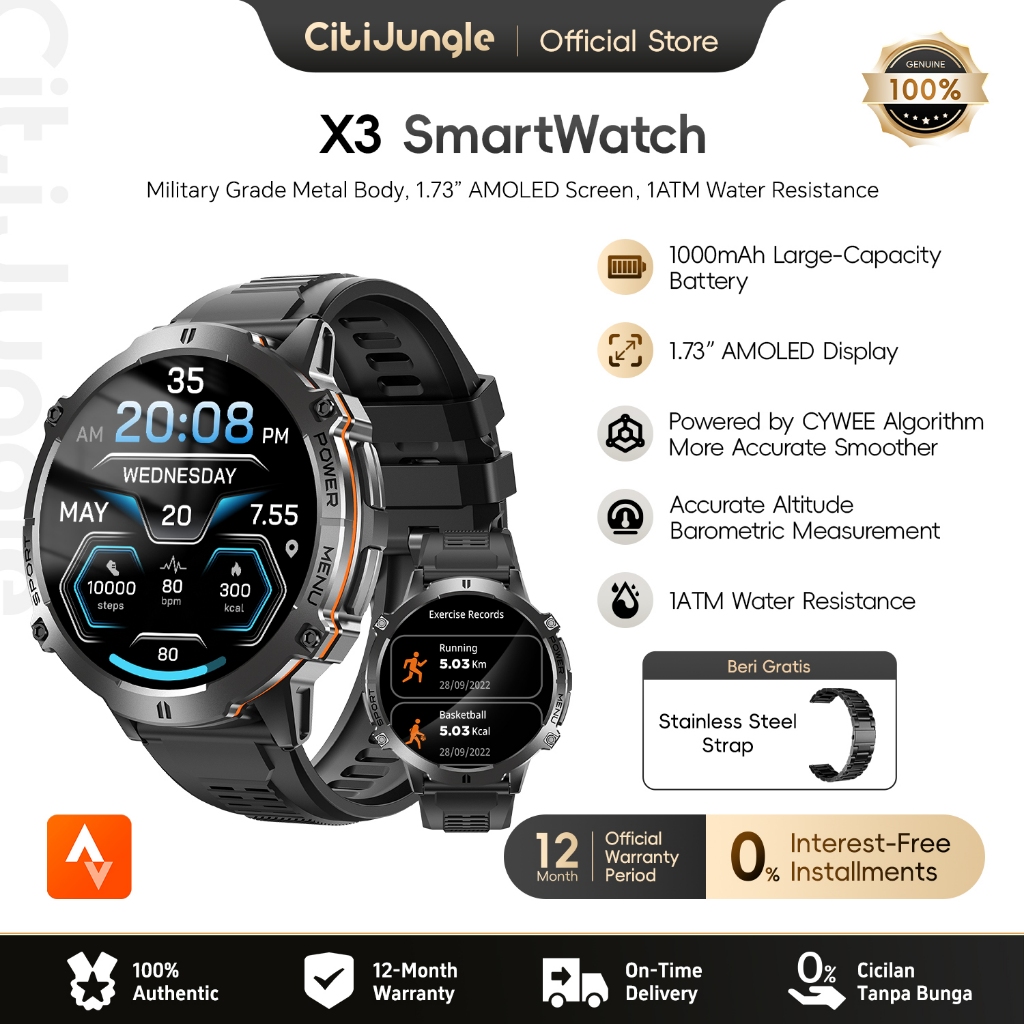 Citijungle X3 Smartwatch 1.72" Amoled Layar Bluetooth 5.3 Baterai 1000Mah Tahan Air 1Atm Kompas Altimeter Ai Watch