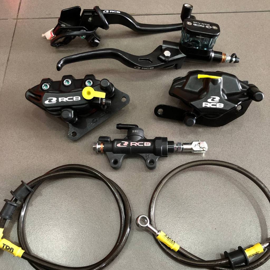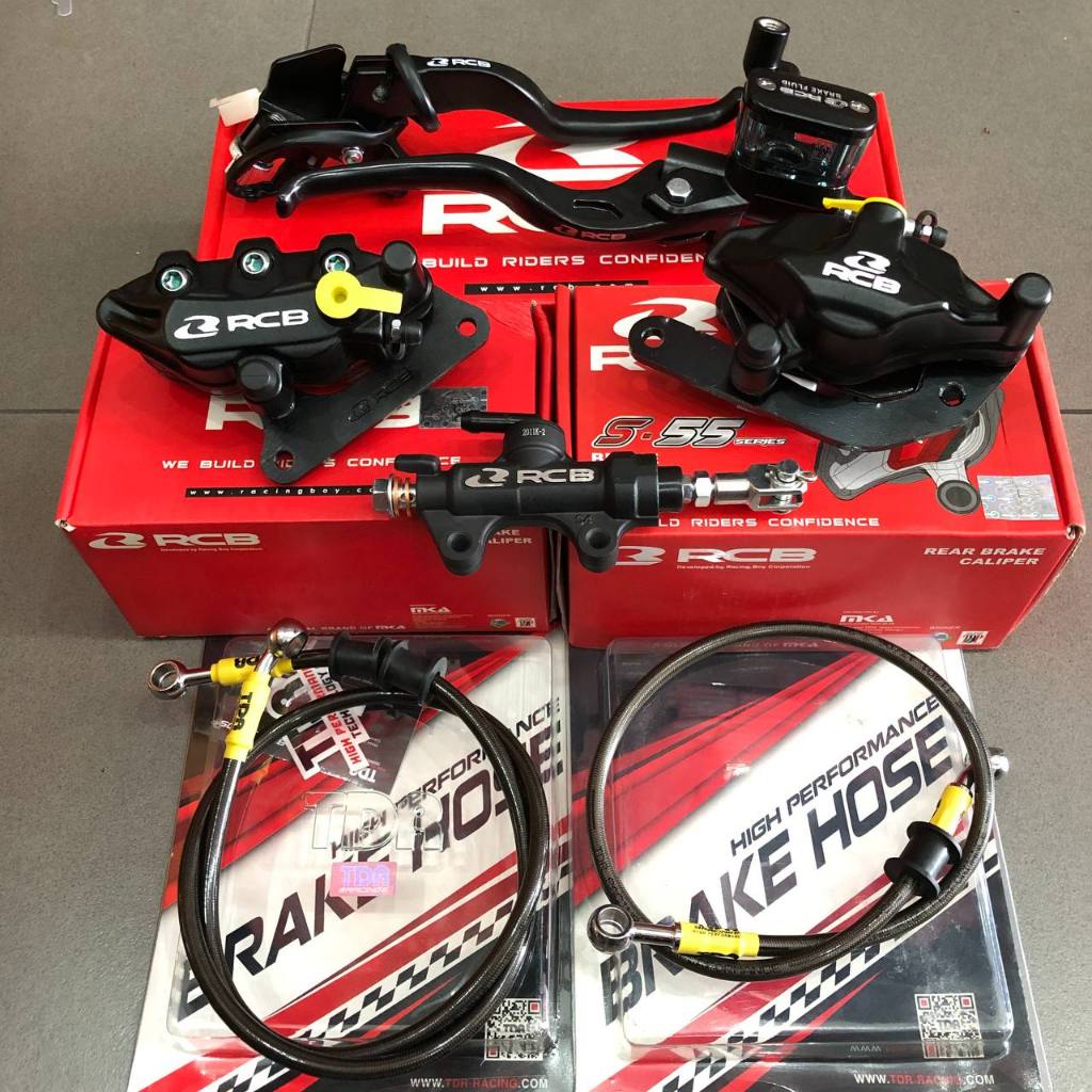 Paketan Master Rem RCB E3 14mm Set Kanan Kiri Kopling + Kaliper Depan Belakang S 2 Piston R55 + Tonjokan E12 Hitam + Sel