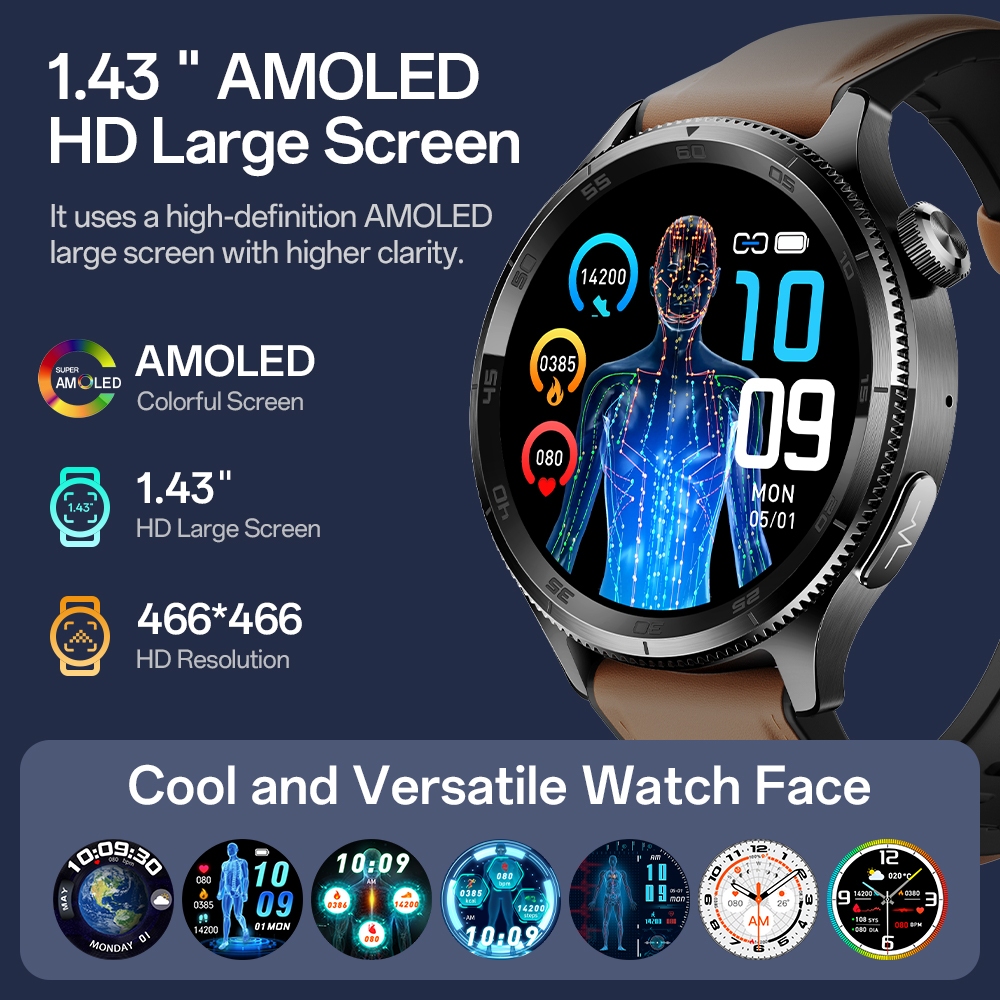 Aolon Pulse Jam Tangan Smartwatch Pengukuran Kesehatan Amoled 1,43 Inci Ecg Hrv Detak Jantung Tekanan Darah Oksigen Dara