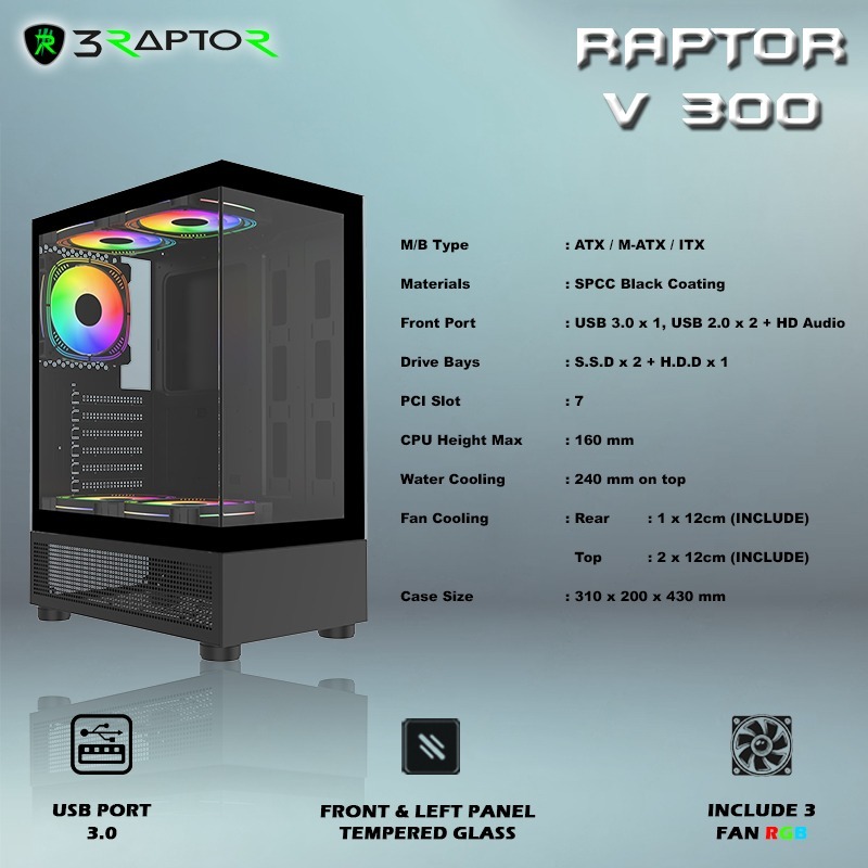 Casing PC Gaming Raptor V300 ATX M-ATX ITX Tempered Glass + 3 Fan RGB - Hitam / Putih