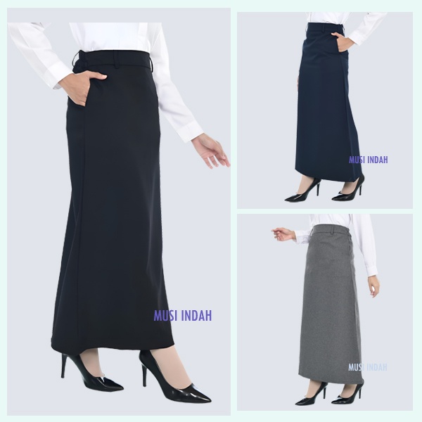 Rok Panjang Hitam los Model A line dan Span Pinggang Karet dan Ada Kantong Saku Wanita Bahan Dasar Formal Untuk Kerja Kantor Kulia