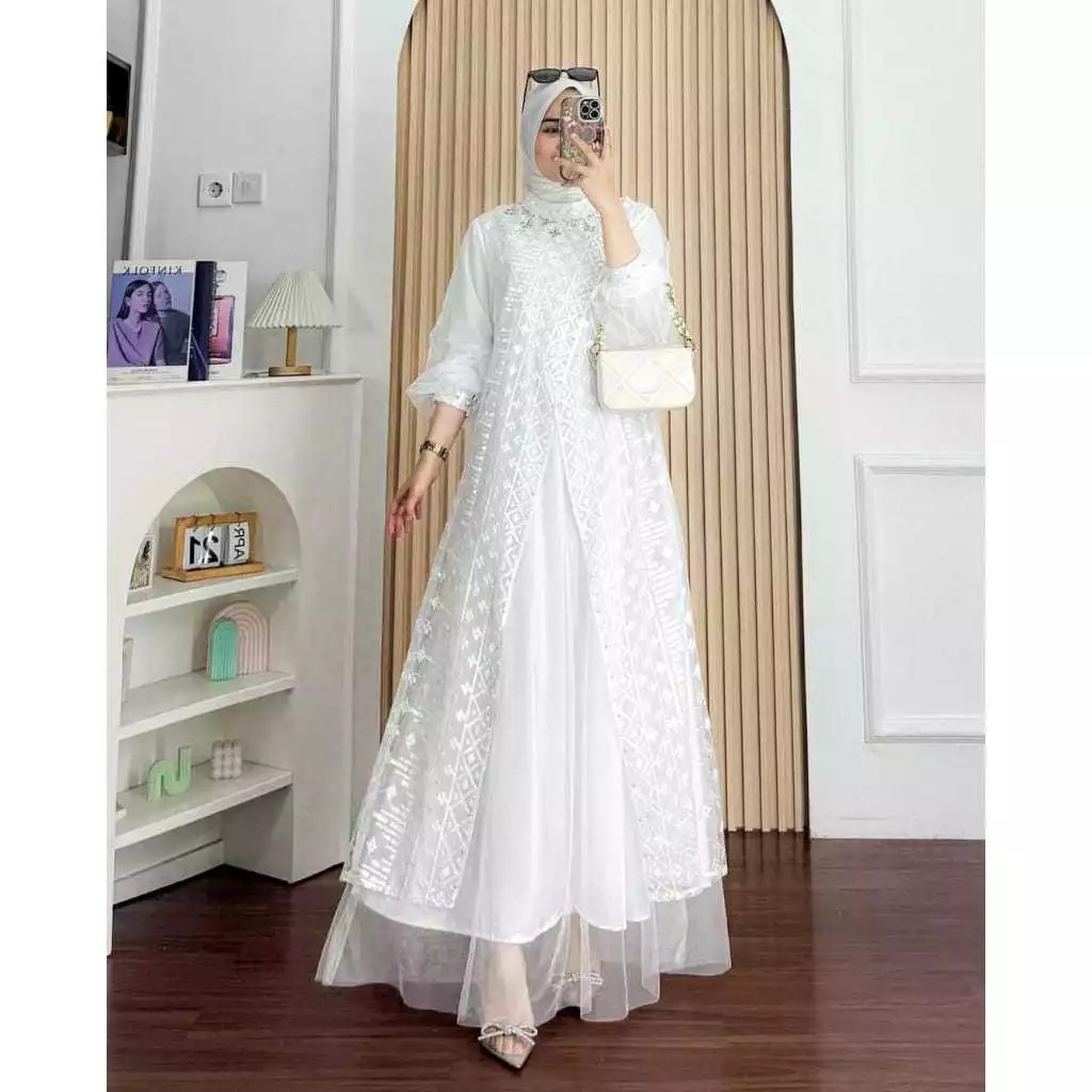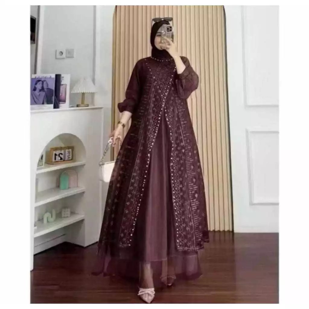 Kayla Dress Gamis Brukat Pesta Mewah Elegan Terbaru 2026 Gamis Burgundy Brokat Tille Mutiara Elegan
