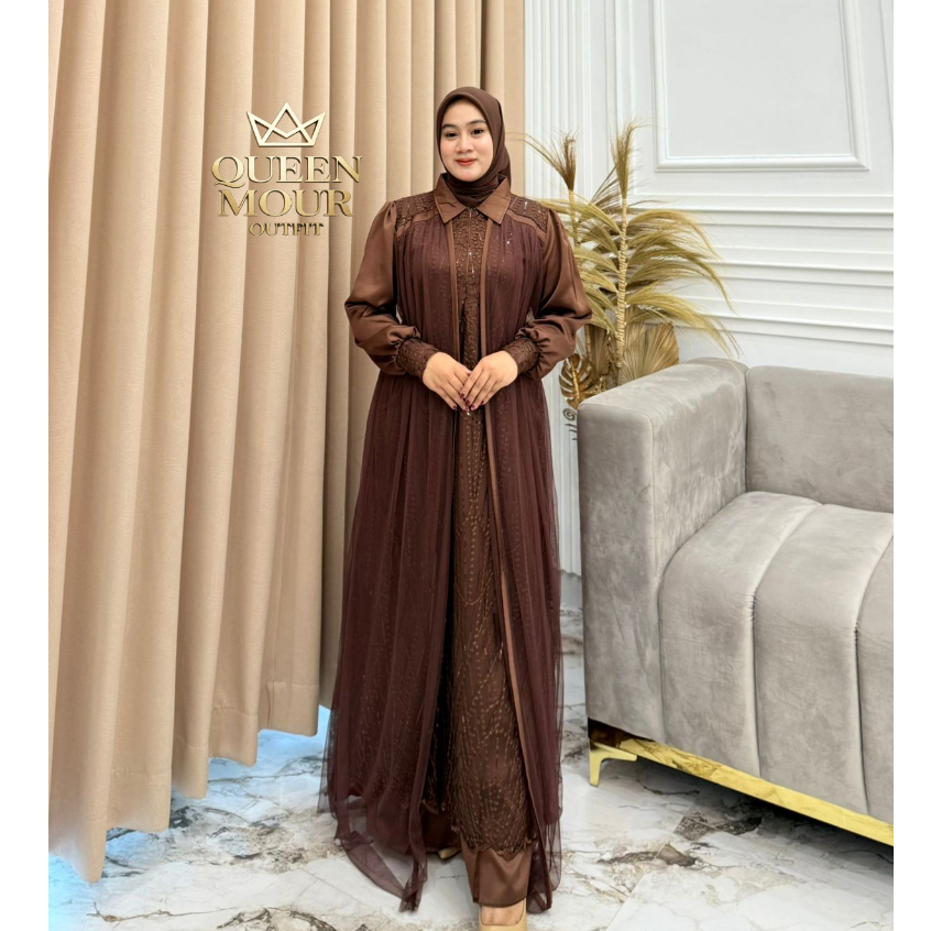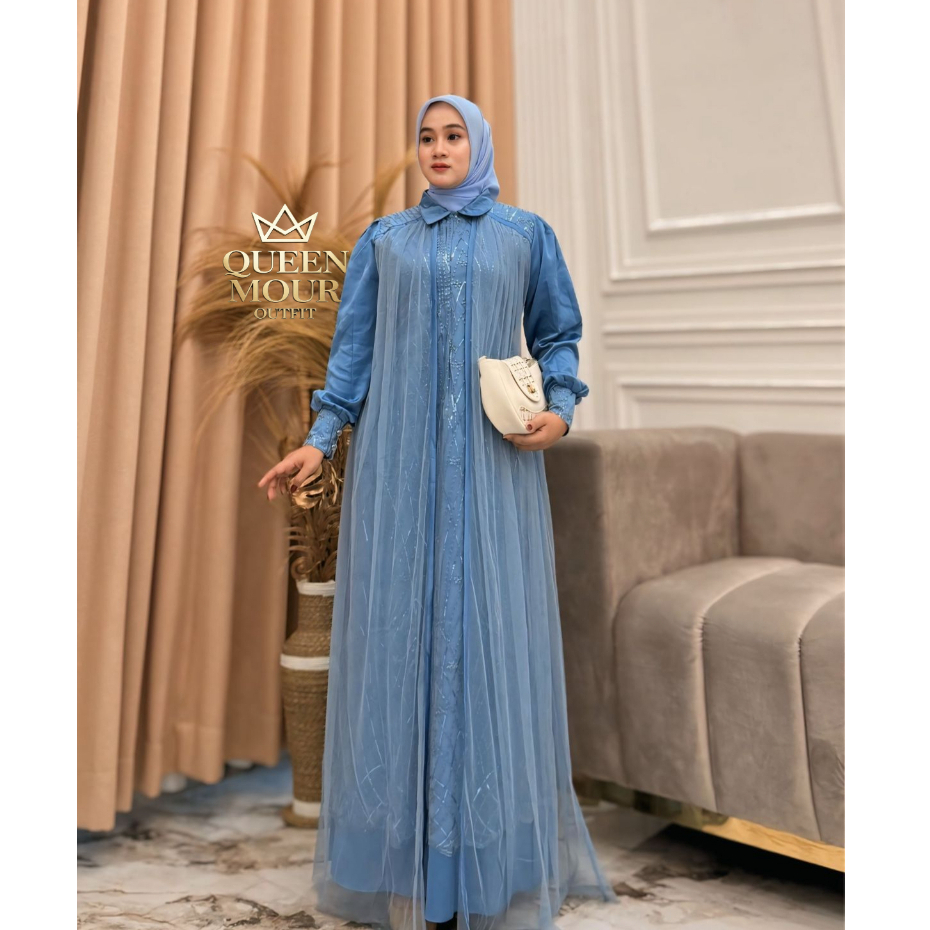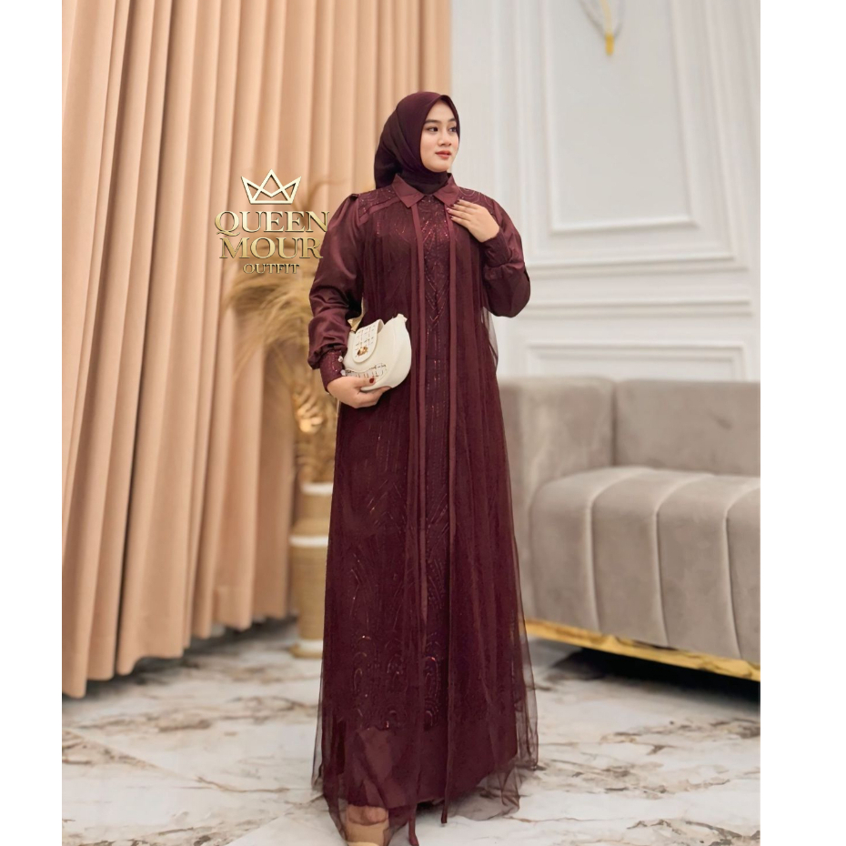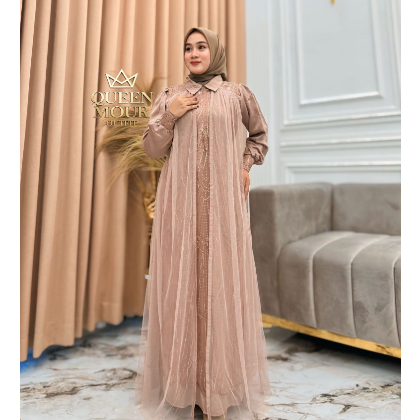 queen mour_outfit Messa Dress Wanita Kekinian Brukat Tille Premium Bahan Silk Gamis Kondangan 2025