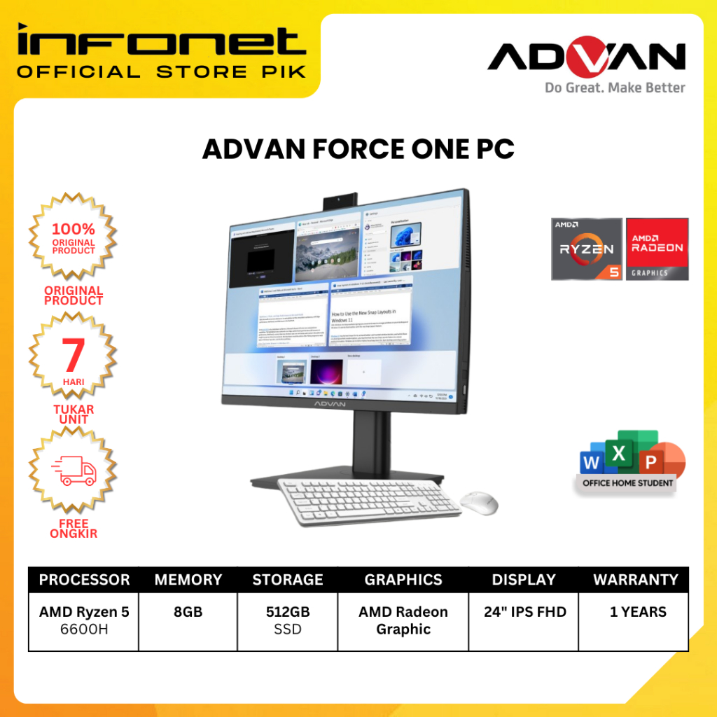 ADVAN AIO FORCE ONE PC RYZEN 5 6600H 8GB 512GB SSD AMD RADEON GRAPHICS 23.8" FHD W11 SILVER WIRELESS MOUSE + KEYBOARD