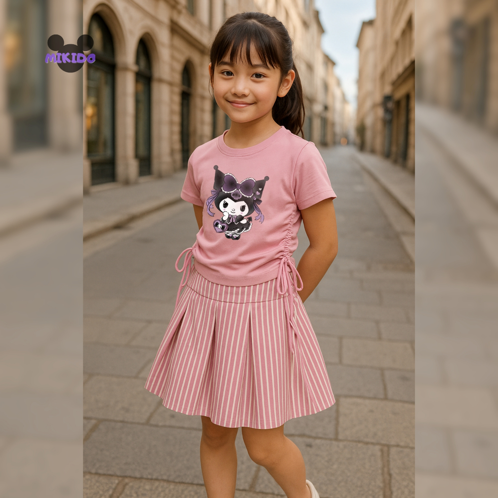 Setelan Kaos Serut Crop Top dan Rok Celana Rempel Salur Perempuan Kuromi Umur 1-14 tahun Part 2