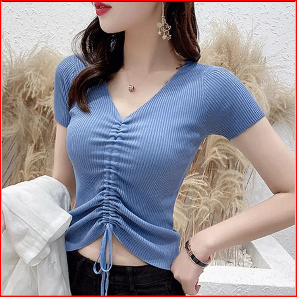 Crop Top Wanita Villing Serut Depan Knit Rib