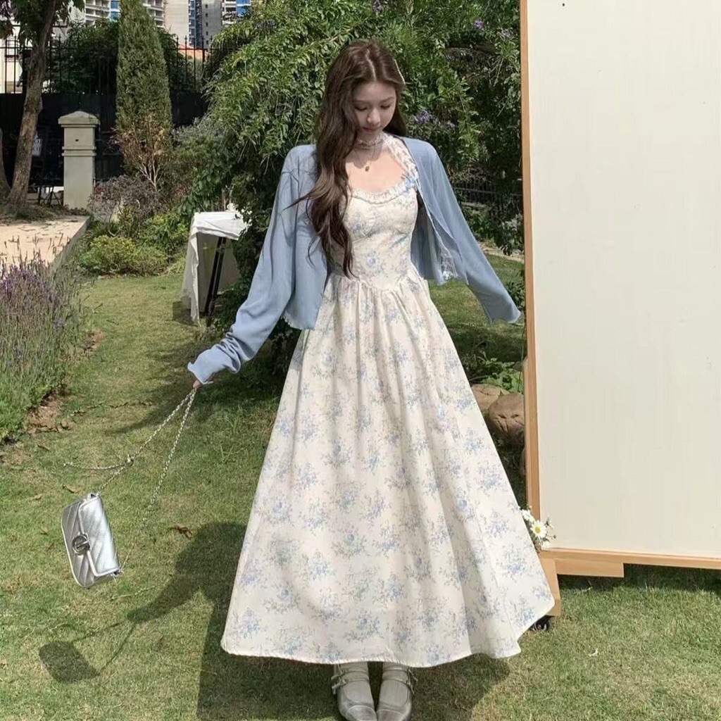 Setelan Gaun Suspender + Kardigan Rajutan Lembut Model Prancis || Dress Panjang Musim Panas Motif Bunga Manis Pinggang Ramping - G067
