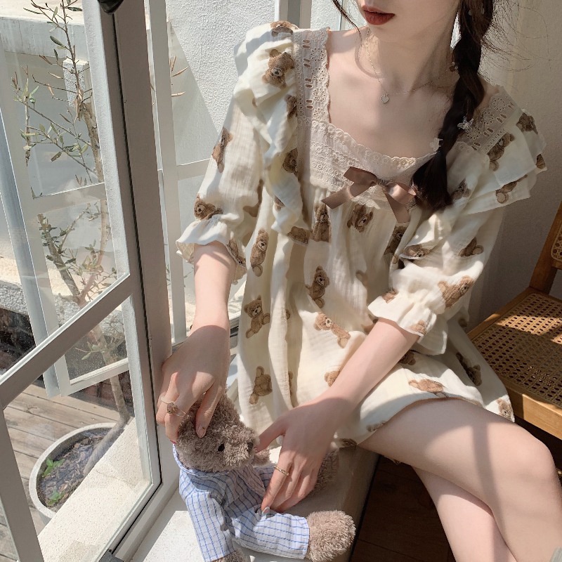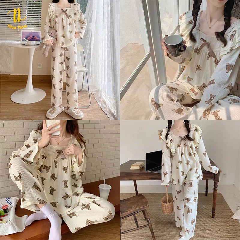 CJSW-B01 TINO TINO SET PIYAMA BAJU TIDUR WANITA JUMBO IMPORT MOTIF BEAR RUFFLE BOW
