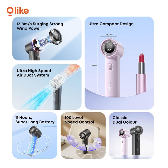 OLIKE PORTABLE FAN PF9 KIPAS ANGIN MINI | TURBO 100 SPEED WITH LED | 3000MAH BATERAI TAHAN LAMA 11 JAM & 24000 RPM HIGH