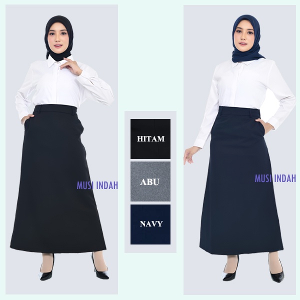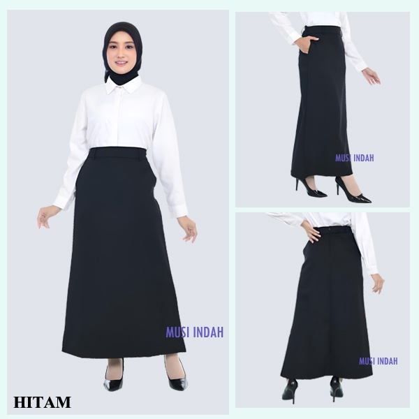 Rok Panjang Hitam los Model A line dan Span Pinggang Karet dan Ada Kantong Saku Wanita Bahan Dasar Formal Untuk Kerja Kantor Kulia