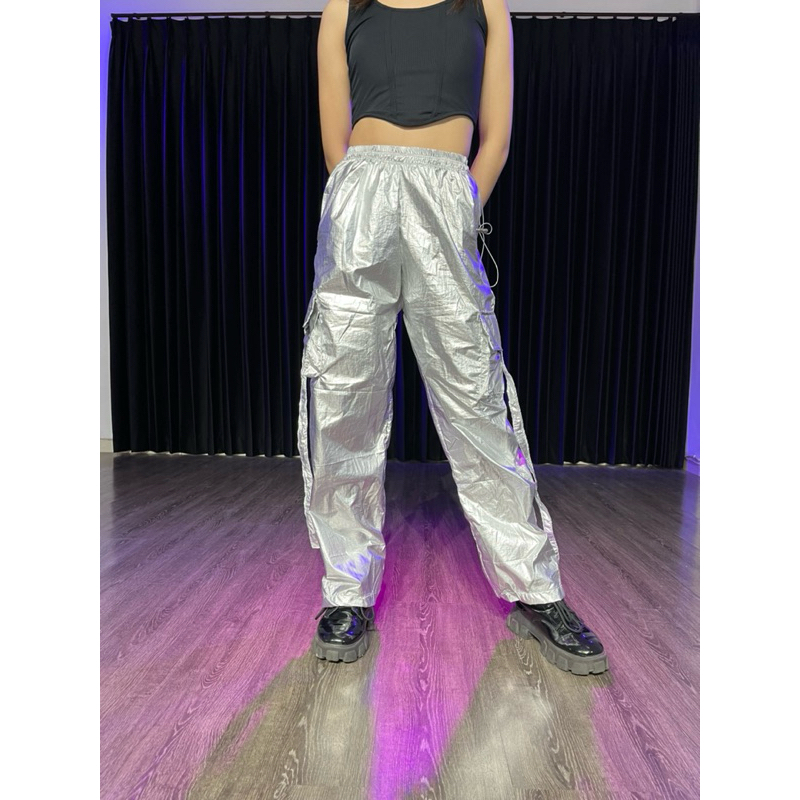 Lazy Bazy | Silver Metallic Parachute Jogger Cargo Pants Pria Wanita Unisex