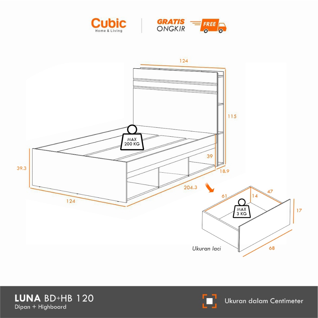Cubic Dipan Kasur 120 X 200 / Ranjang Tempat Tidur / LUNA HBD 120