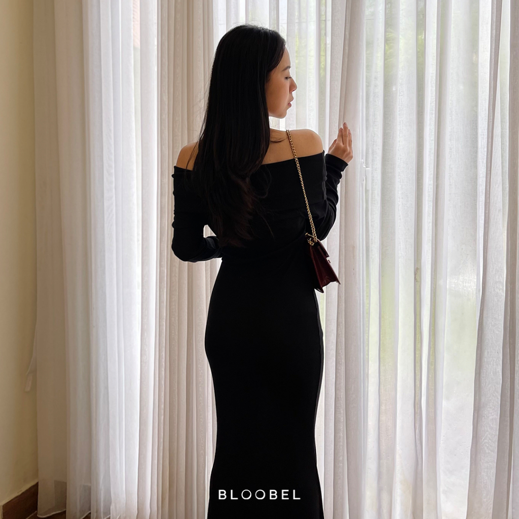 FOTO ASLI BAHAN ADEM DINGIN Bloobel - Juliette Dress DRS115 Sabrina Ribbed Knit Dress Long Sleeve Pakaian Wanita Off Shoulder