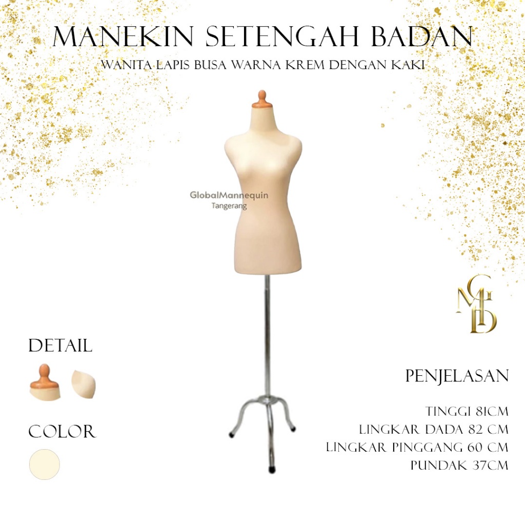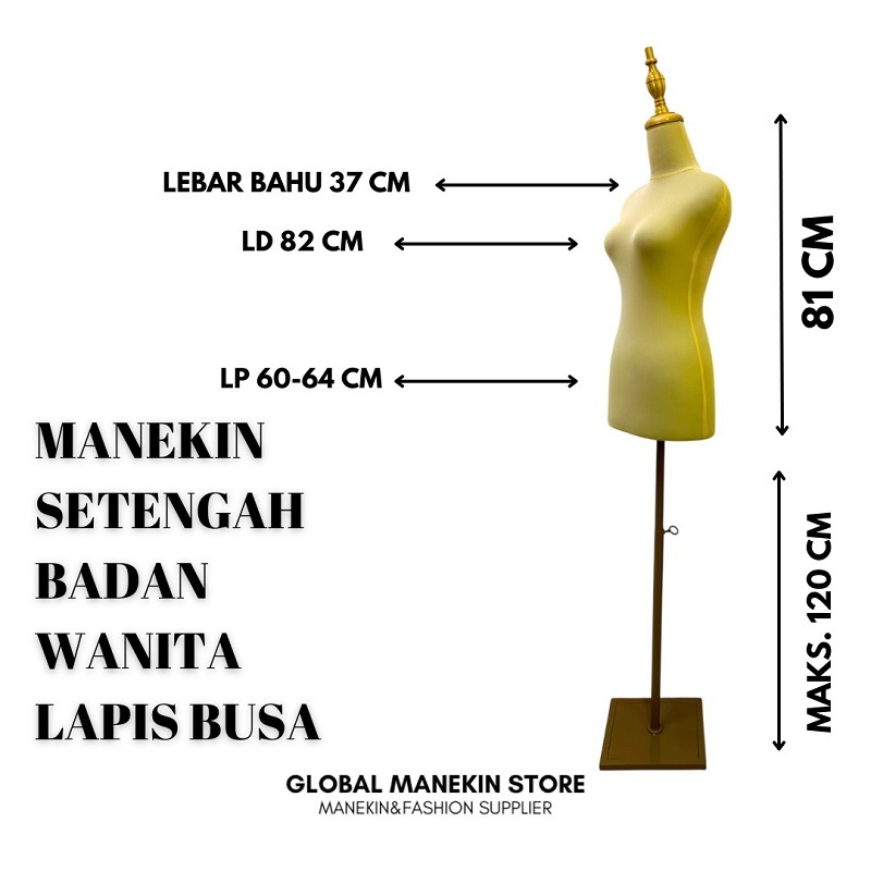 Manekin setengah badan wanita lapis busa warna krem dengan kaki