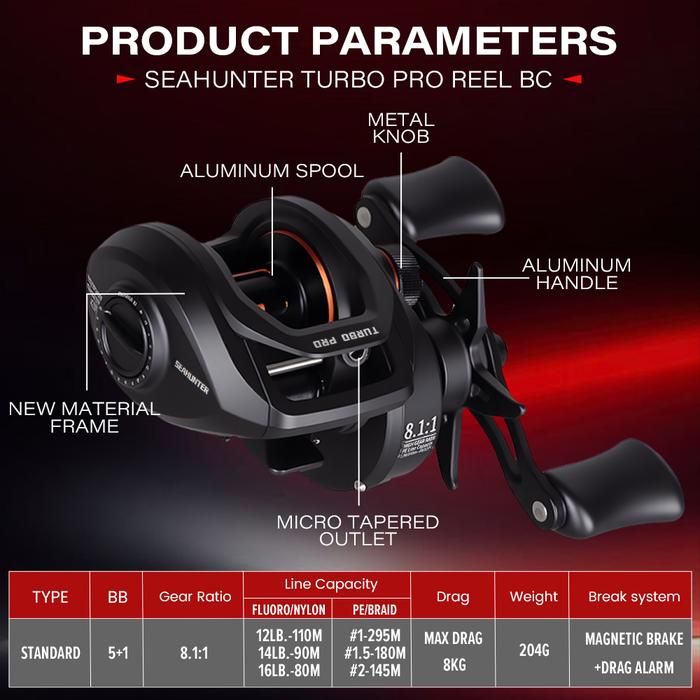 SeaHunter Turbo Pro Reel Pancing Baitcasting Fishing Reel,Drag Clicker,5+1 BB Ball Bearings,8.1:1