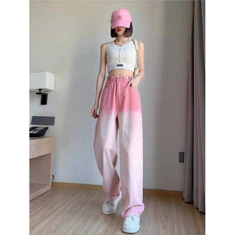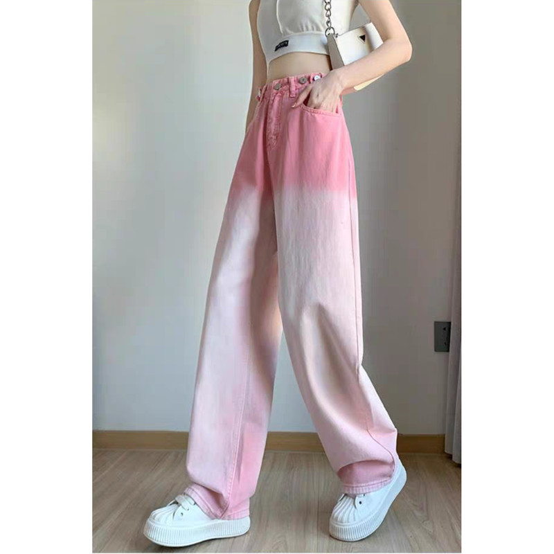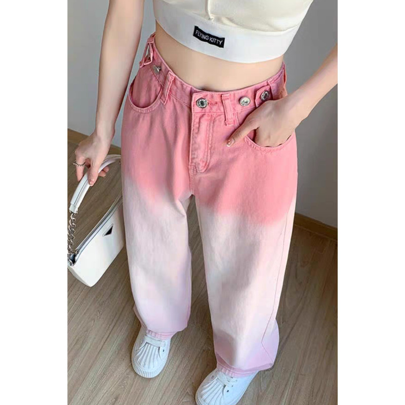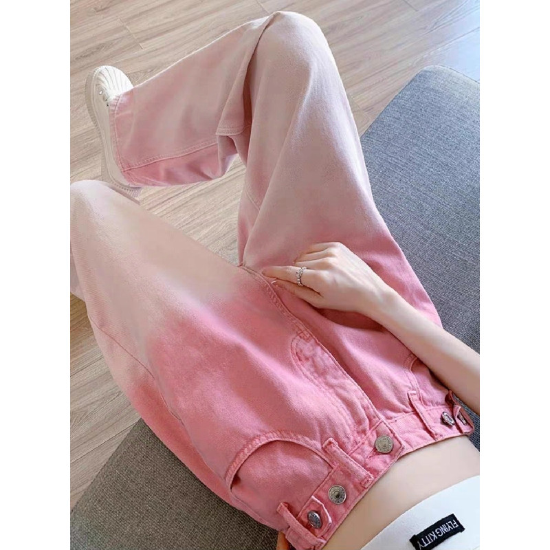MEET.U Celana Jeans Wanita Jins Lurus Warna Pink Gradient Longgar Pinggang Tinggi Gaya Korea