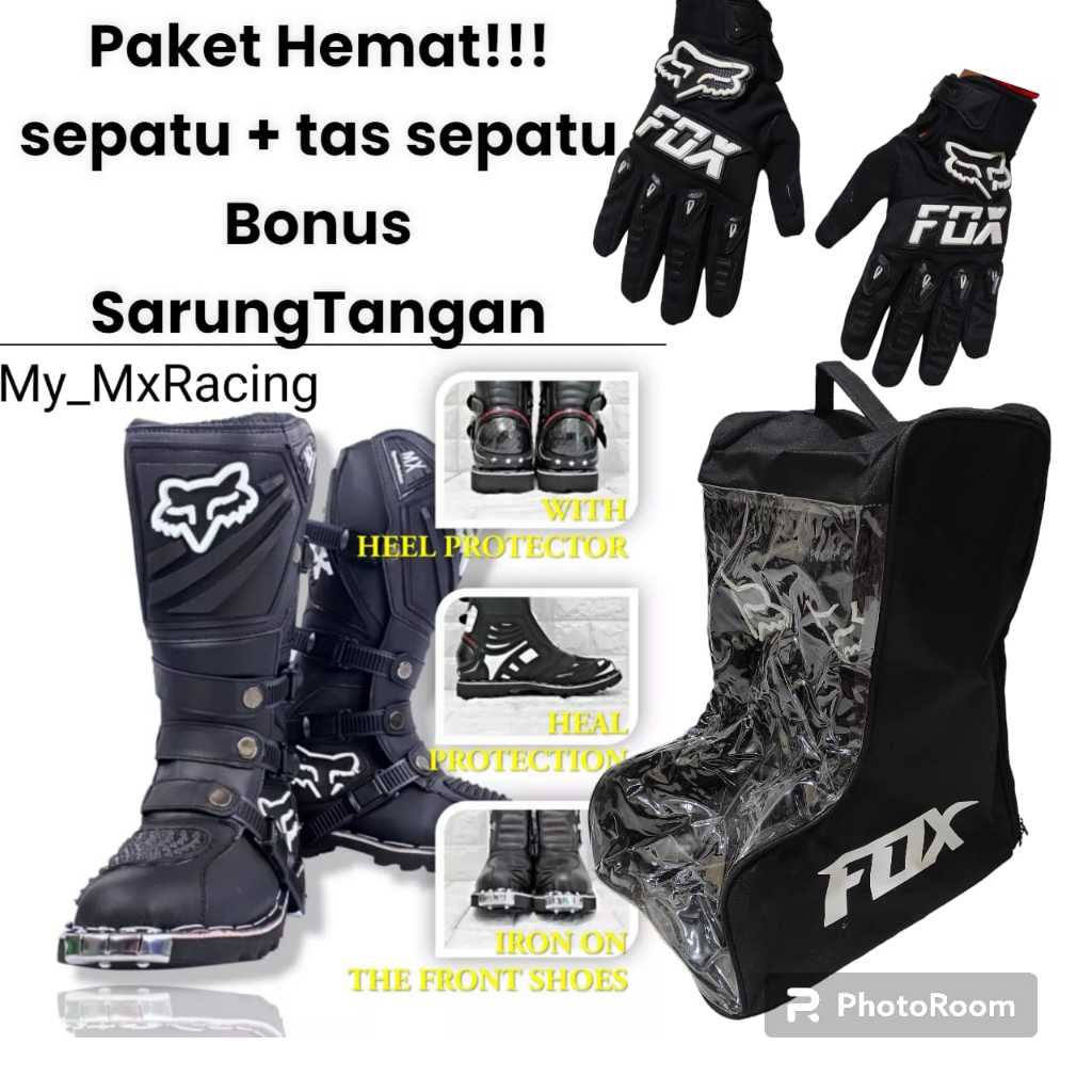 TERMURAH paket hemat sepatu cross trail ujung besi plus tas jingjing buat sepatu bonus sarung tangan boots fx grey fou