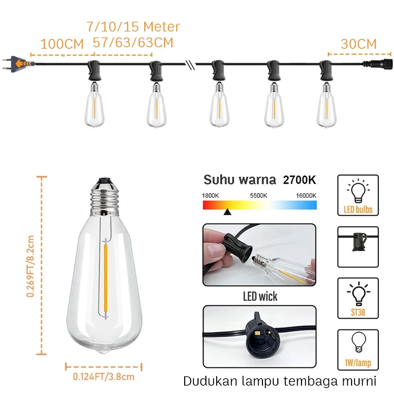 Qimedo 25 Lampu Led 15 Meter Kabel Fitting Tahan Air Kafe Bola Komplit Lampu Gantung Outdoor
