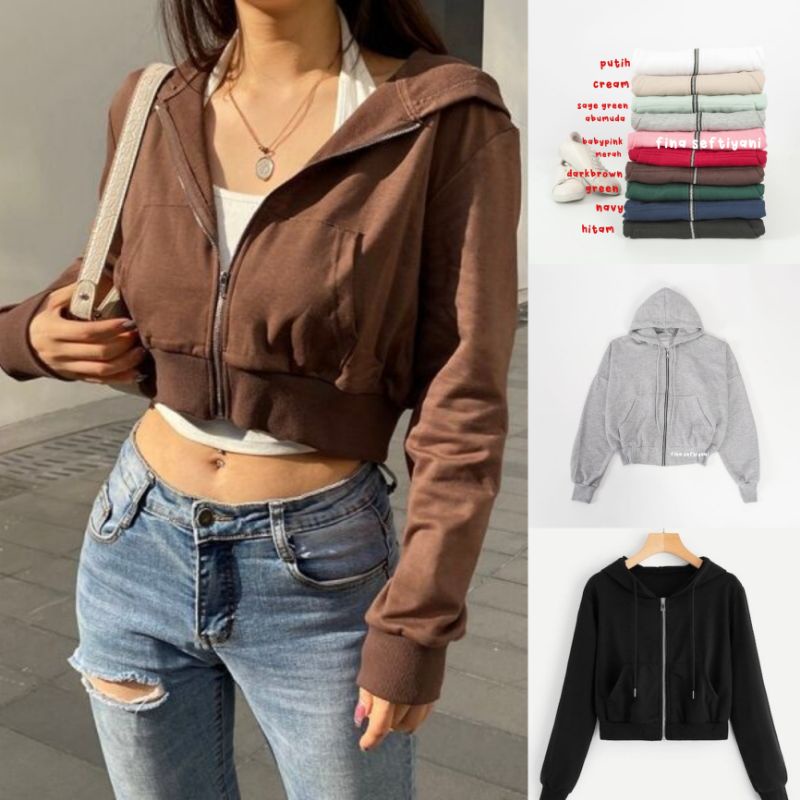 Carla Crop Ziper Hoodie/Crop Zip Up Hoodie Oversized brown abu putih hitam Jaket Polos Crop FINASEFTIYANI