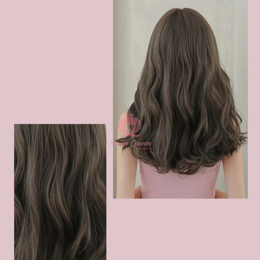 7JHH 52 cm C-0304 Wig Panjang Pendek Rambut Alami Ikal Keriting Bergelombang Dengan Poni Hitam Cokelat Keren Cokelat Tua