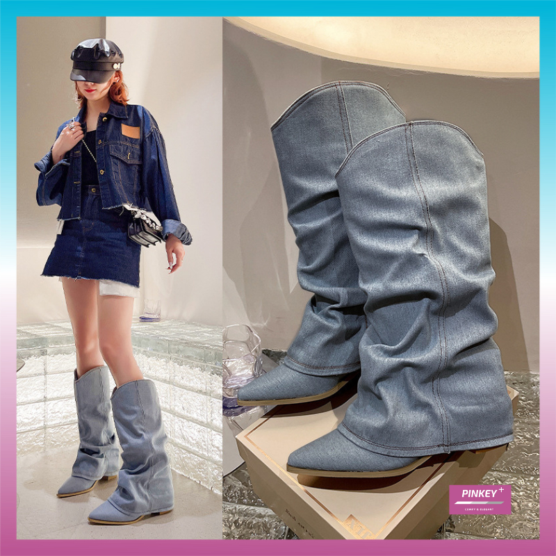 ✅PINKEY P340 Sepatu Boots Denim Wanita Hak Tinggi Tebal Ujung Lancip Biru - Shoes