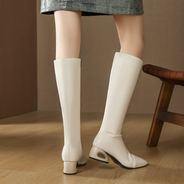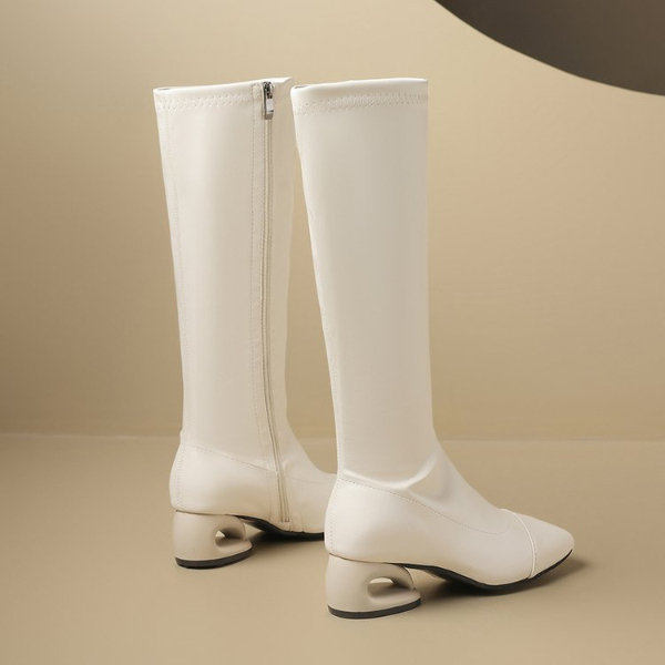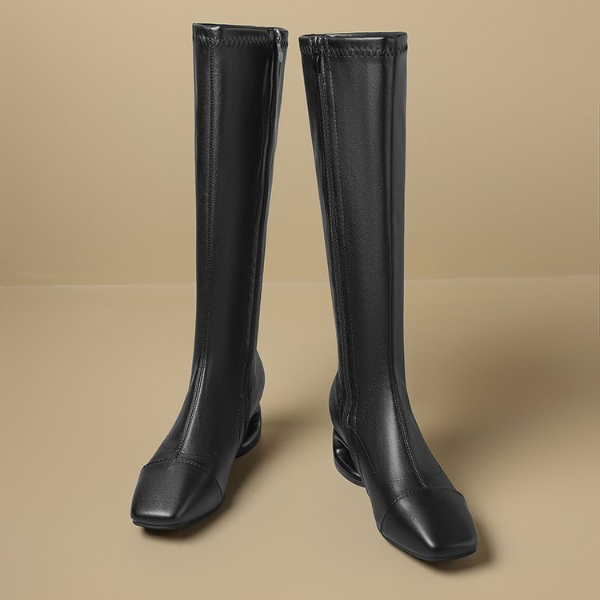PINKEY P414 Long Boots Wanita Hak Rendah Unik – Knee High Boots Hitam Putih Ujung Cap Toe