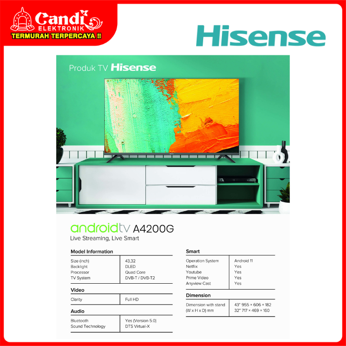 HISENSE 32 inch Smart LED TV - Android 11.0 - Full HD - Dolby Audio - Voice Search/Google Play/Netflix/Youtube - Wifi/HDMI/USB/Bluetooth - Digital TV (Model : 32A4200G) | TV LED 32 Inch Murah