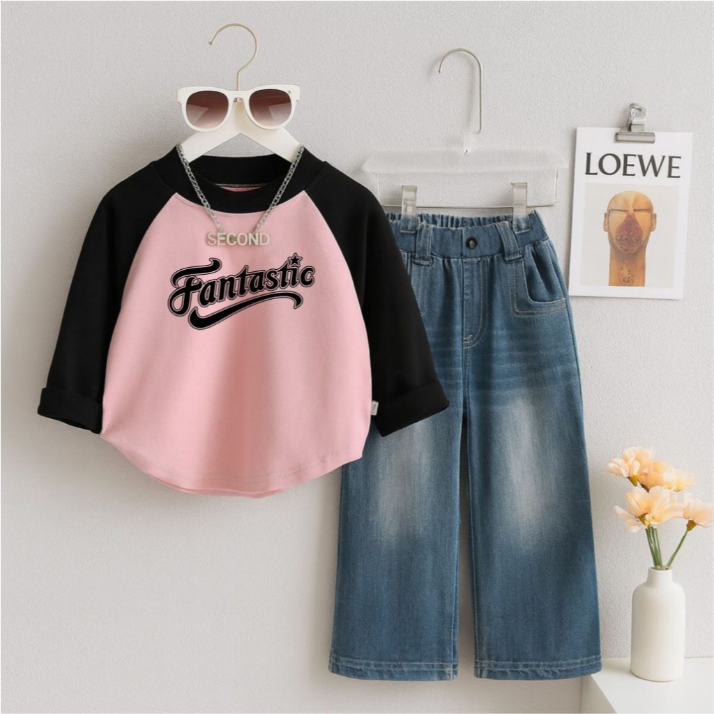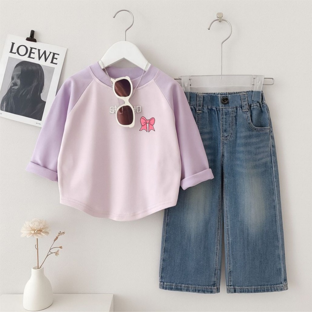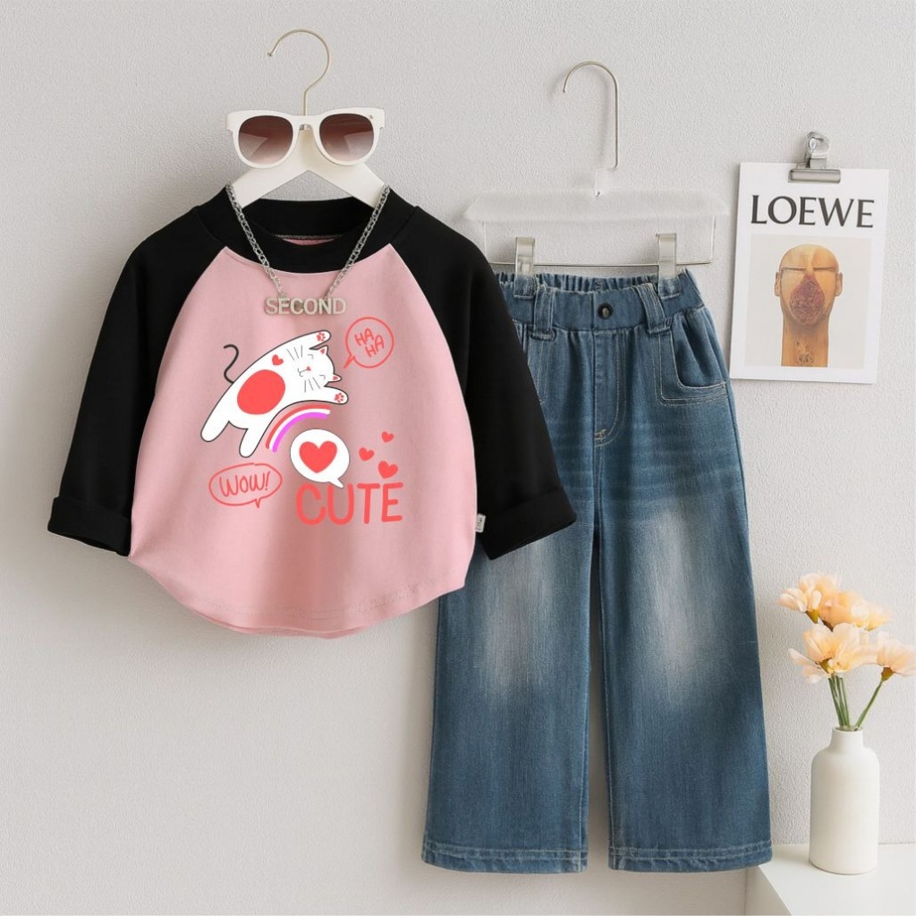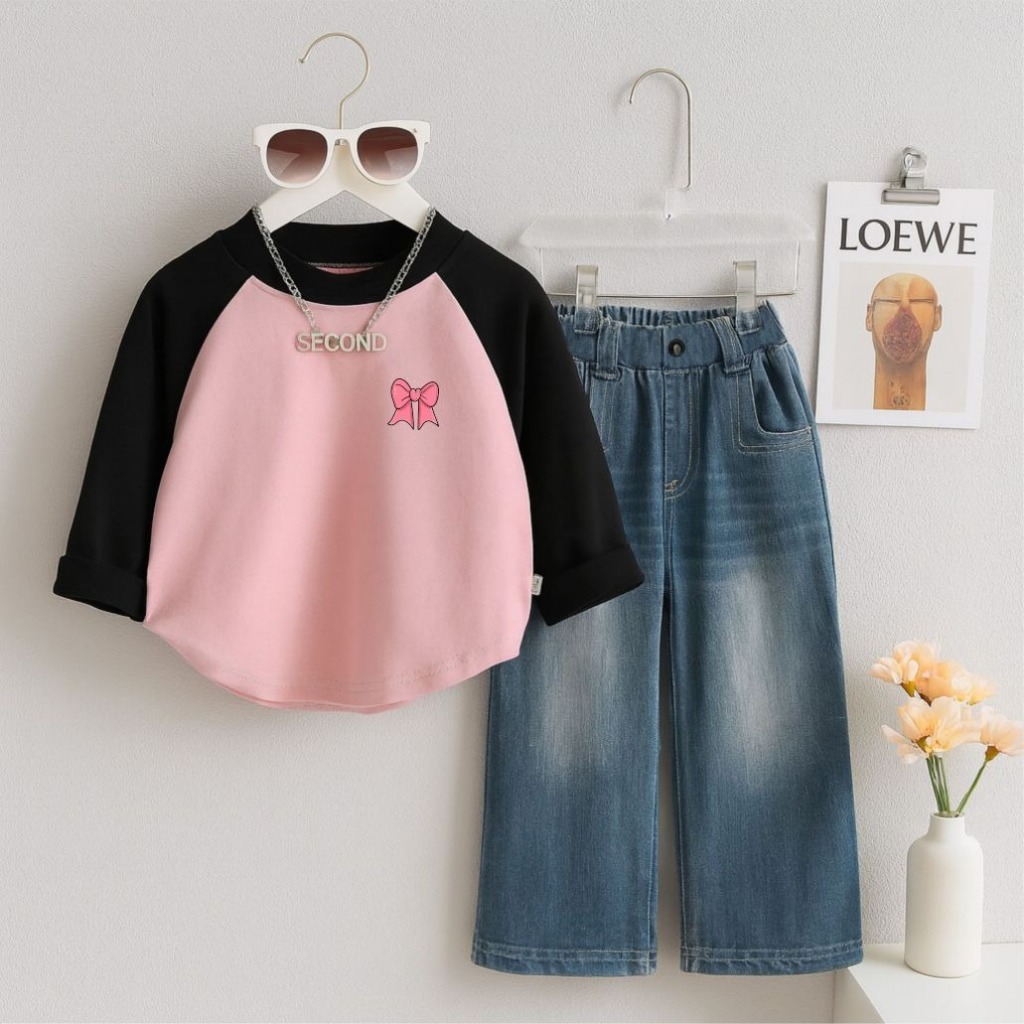 Setelan Baju Anak Kaos Raglan Lengan Panjang + Celana Jeans Denim Lebar Unisex Anak Perempuan Laki Laki Usia 1-12 Tahun