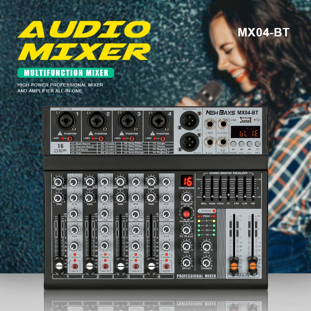 NEW BAXS MX04BT mixer profesional 4-channel built-in EQ 16DSP Bluetooth/USB/PC/MP3 playback modeEQ/alat perekam built-in