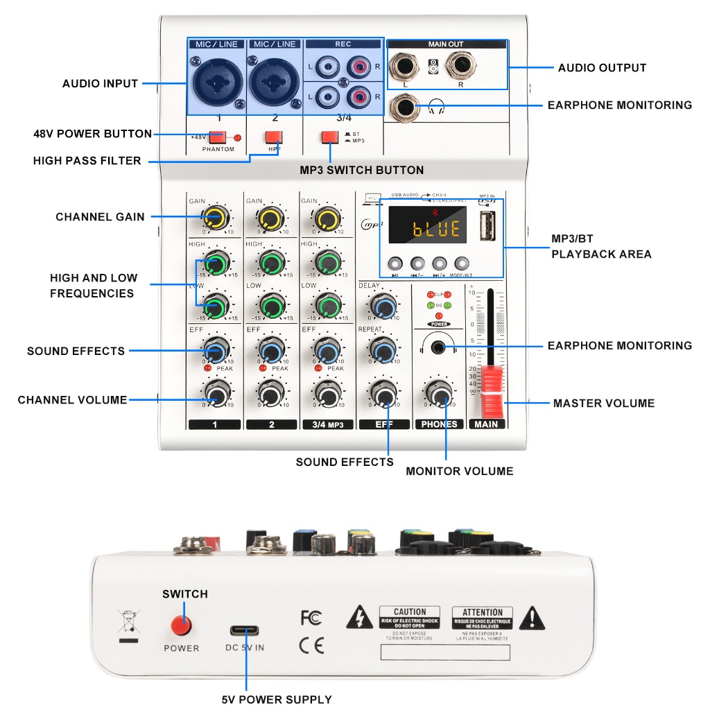 MINI mixer audio Metal 5v 4channel Bluetooth adjusting the 48V sound from the flash drive USB, recording and singing. Mo