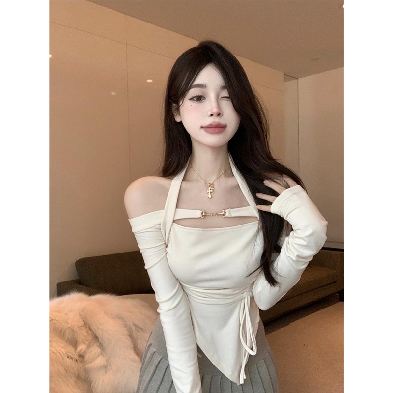 Cohan Ds011 Women's CropTop Slimbody Square Neck Long Sleeve Hitam Putih S/M/L