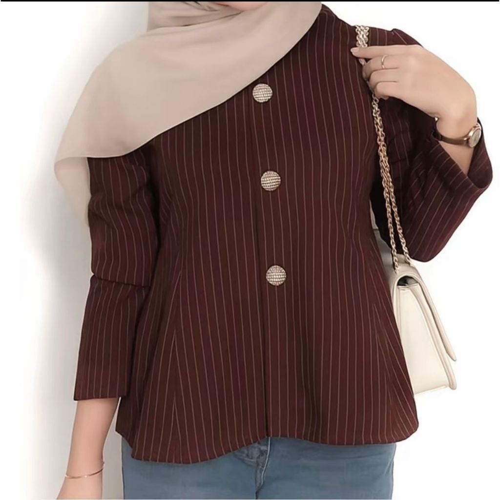 Arika Blouse Stripe Atasan Peplum Wanita Salur Lengan Puff Fit Body Fitted - Blouse Atasan Wanita
