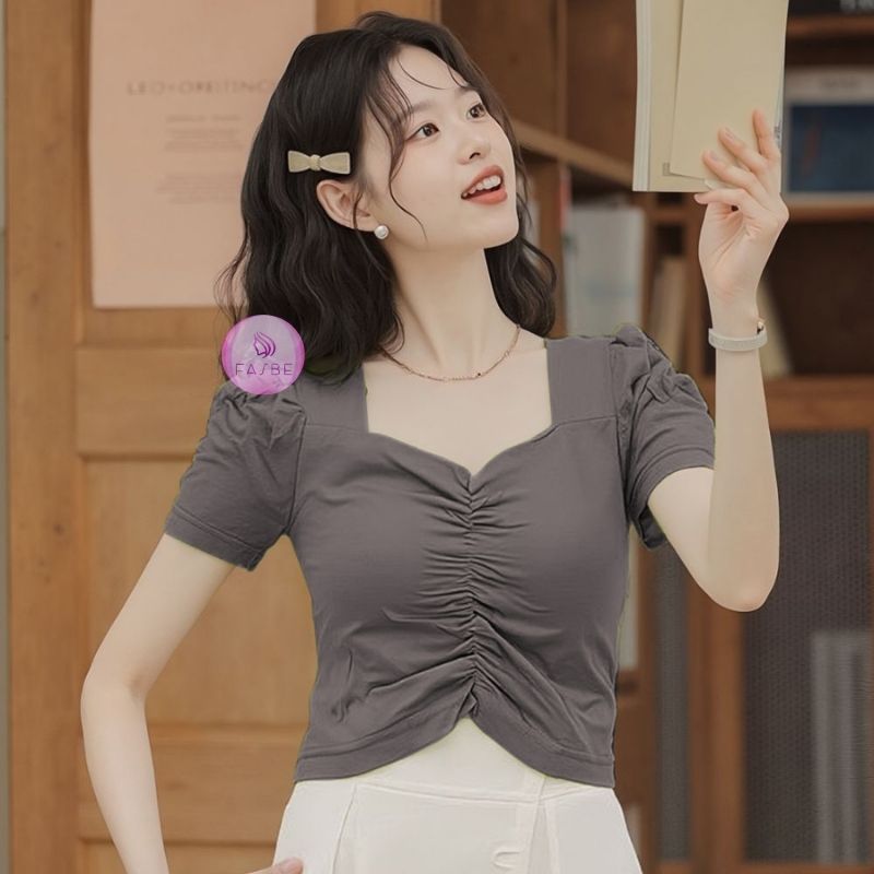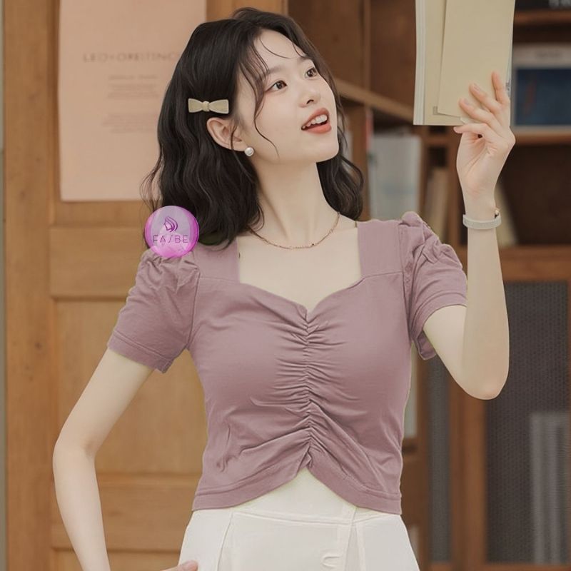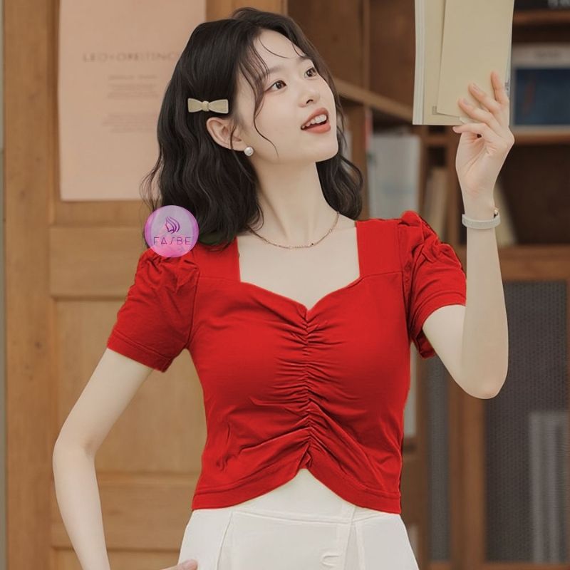 Atasan wanita Crop Blouse Korean Style Lengan Puff Spandex premium Quality 6010