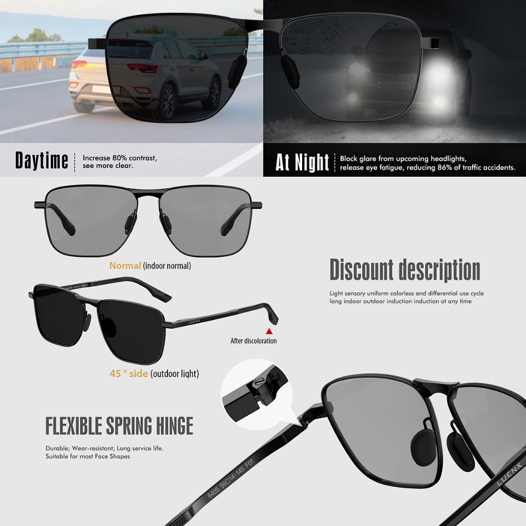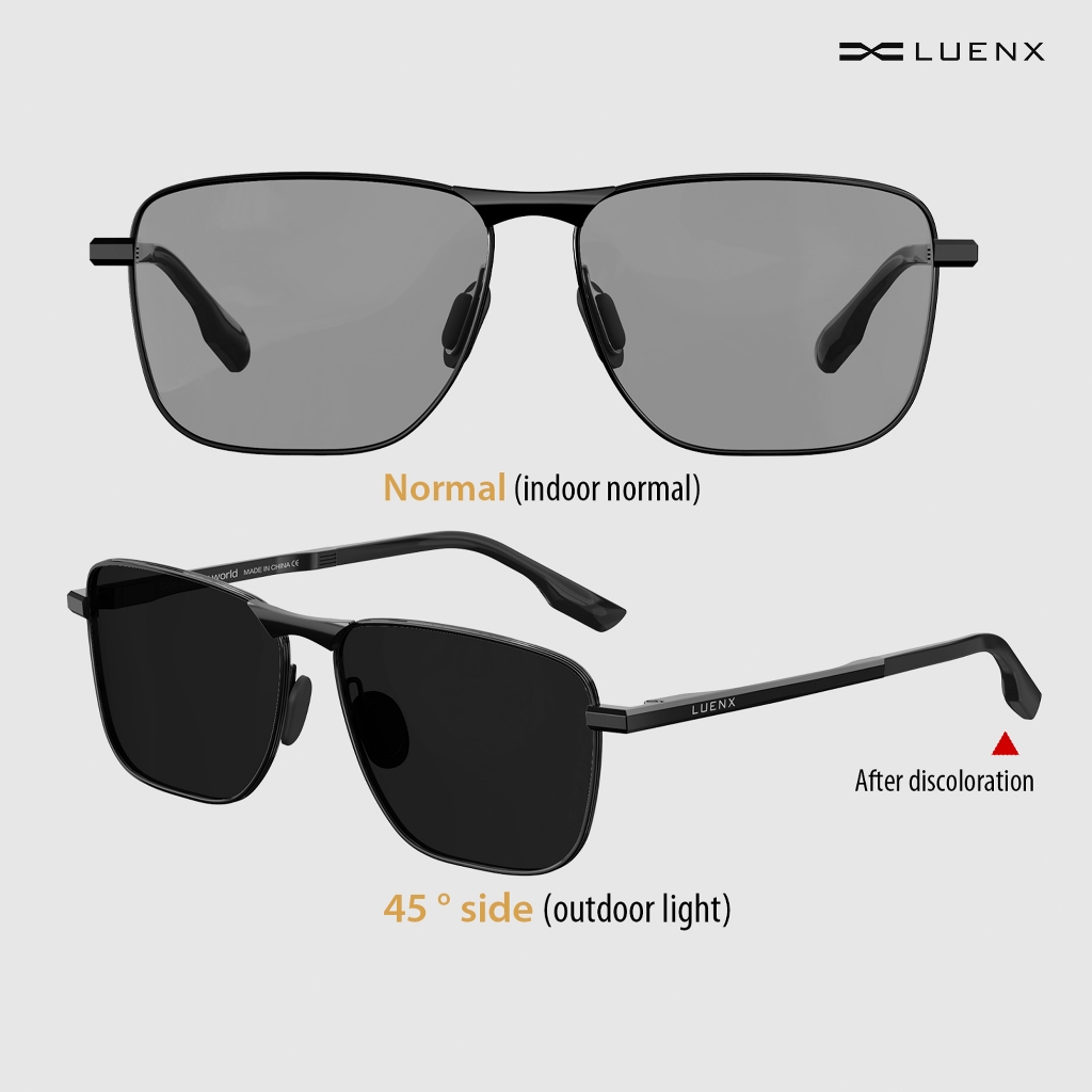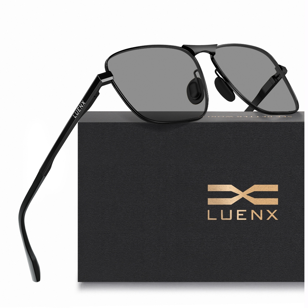 Luenx Kacamata Hitam Photochromic sunglasses, photochromic lenses Rectangular Polarized Aviator Sunglasses Unisex Retro