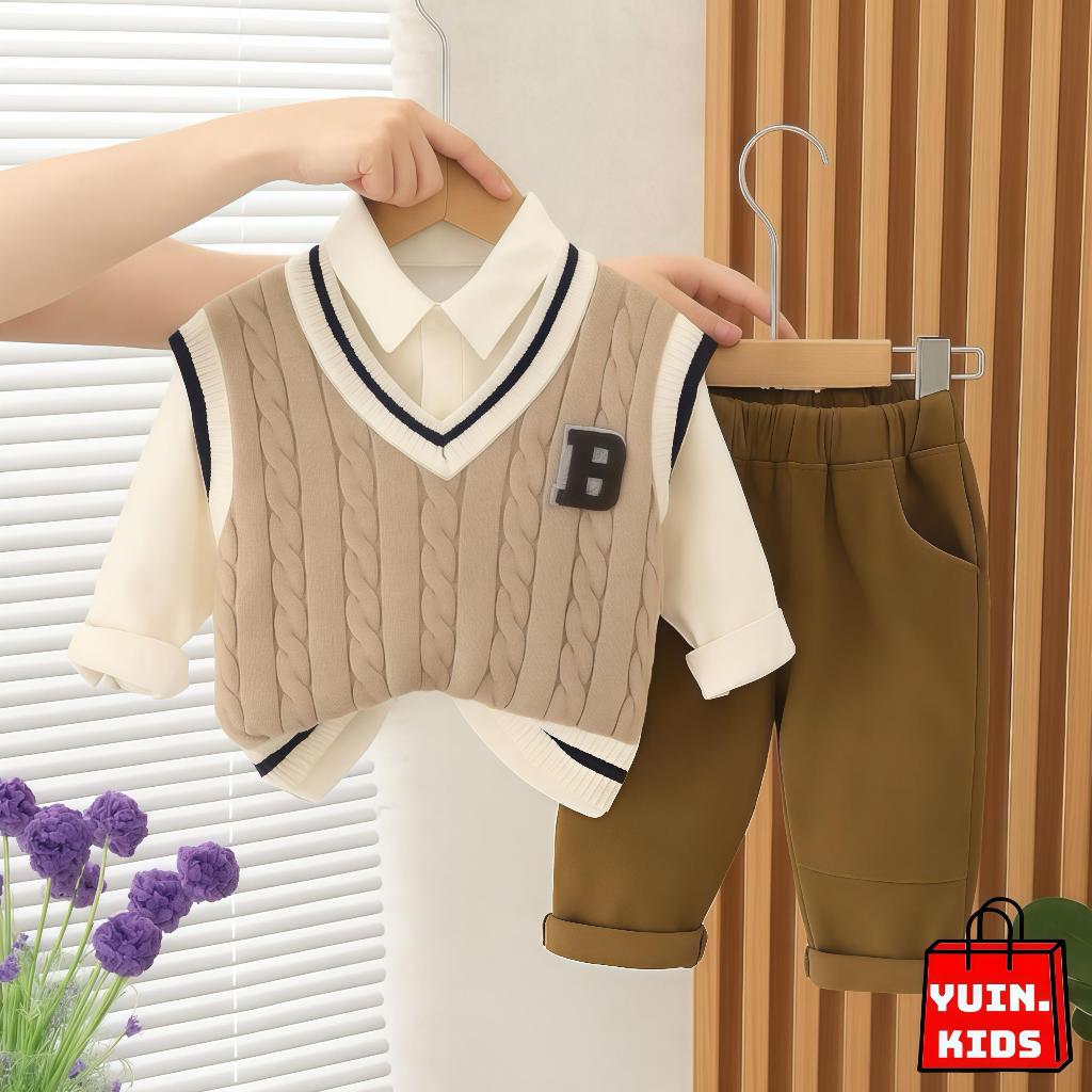 Setelan 3in1 Anak Laki-laki 1-5 Tahun Motif B 3D Kemeja Rompi Rajut Dan Celana Chinos Panjang Anak