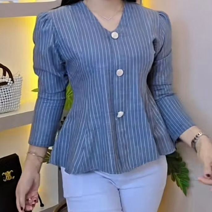 ELEZZA- Arika Blouse Stripe Atasan Wanita Peplum Lengan Panjang Puff Fit Body Fitted