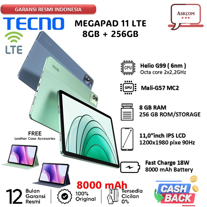 TECNO MEGAPAD 11 4G LTE 8+8GB/256GB 11.0" inches FHD+ 90Hz 8000 mAh GARANSI RESMI FREE LEATHER CASE