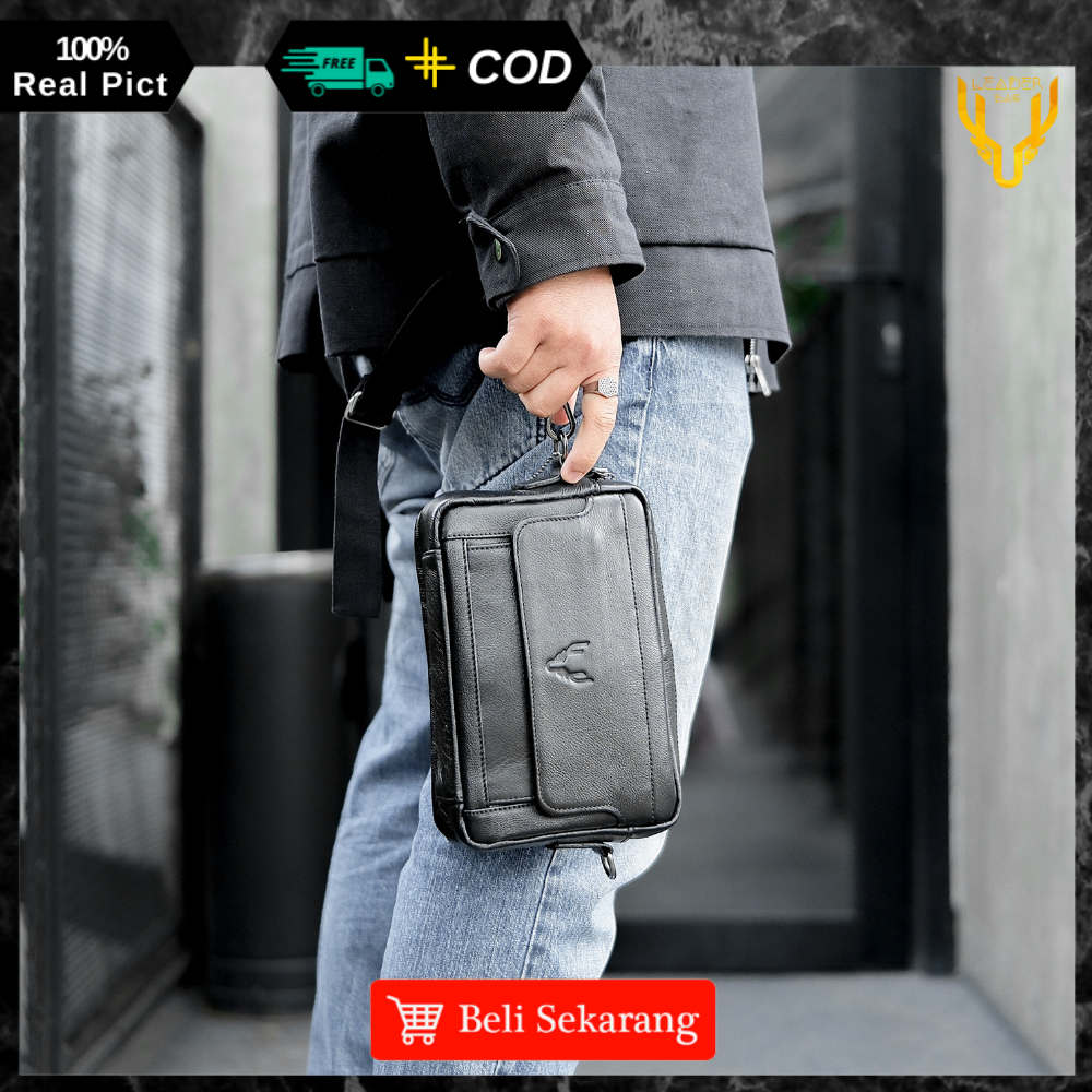 Tas Selempang Pria Kulit Sapi Asli Leaderbag Hitam Premium Handbag 3in1 Waterproof Keren Multifungsi