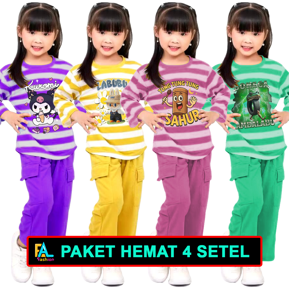 SETELAN ANAK PEREMPUAN 3-12 TAHUN CELANA CARGO PP SALUR PAKET GROSIR TEMA ANOMALI
