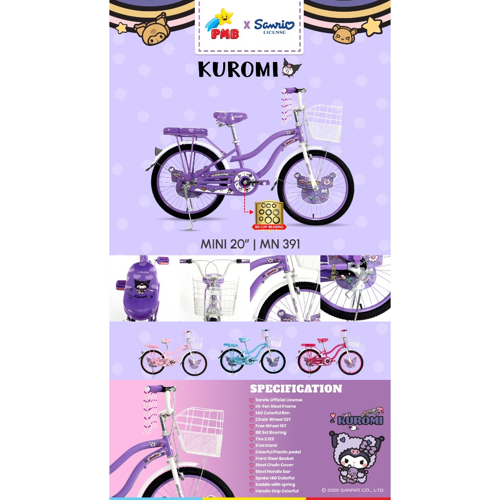 Sepeda mini REMAJA SIZE 20 INCH MORTEIN Sanrio KUROMI CITYBIKE kranjang boncengan untuk anak perempuan 8 tahun - Remaja