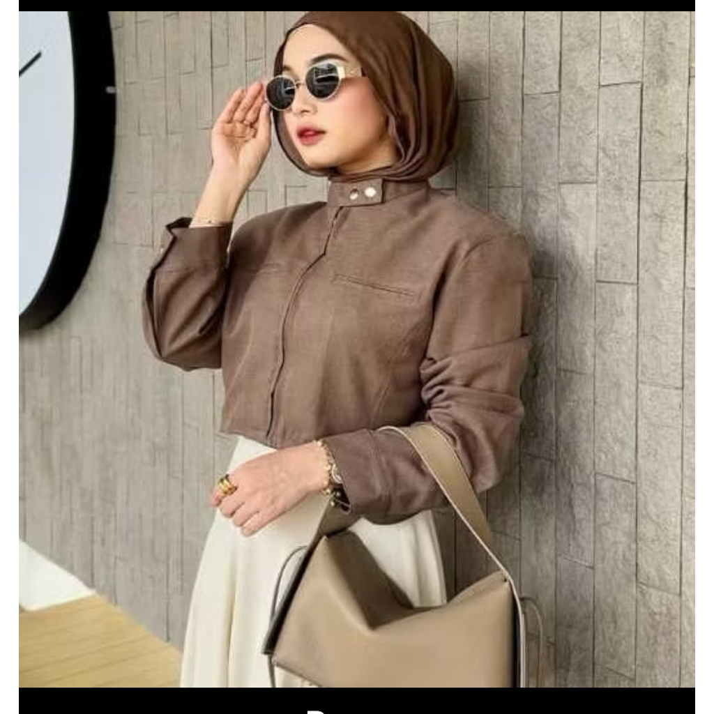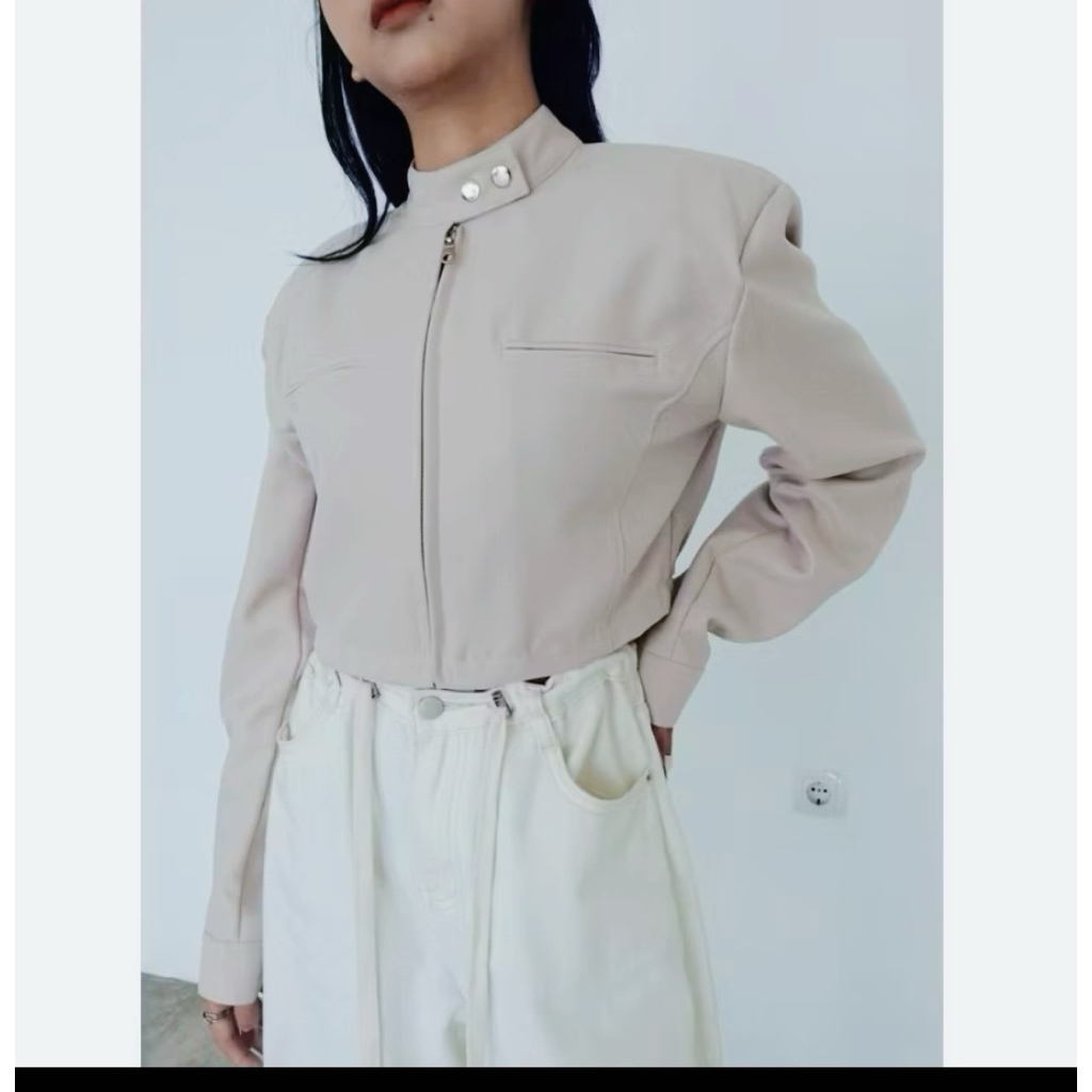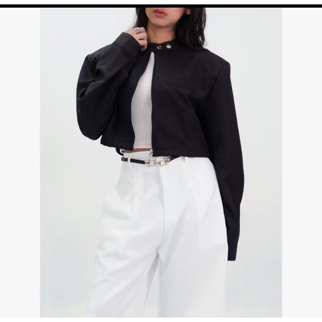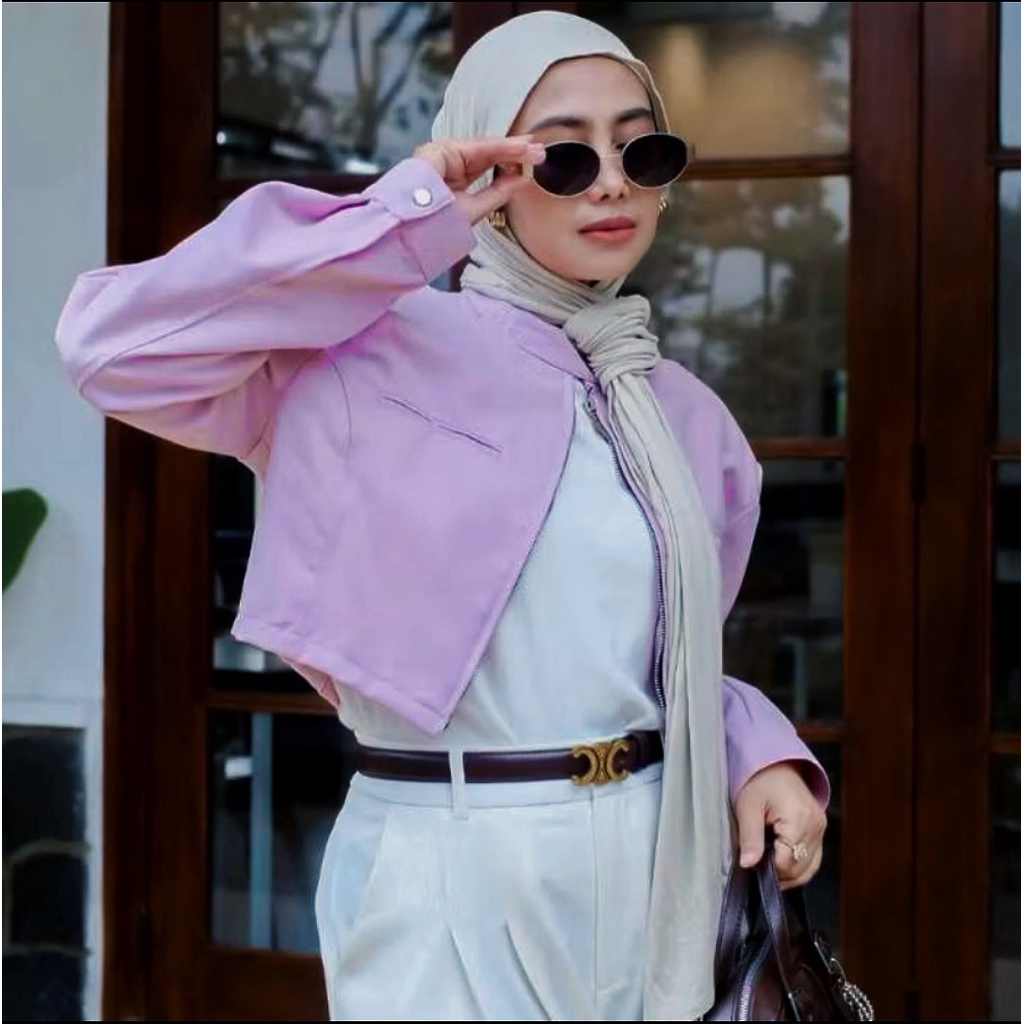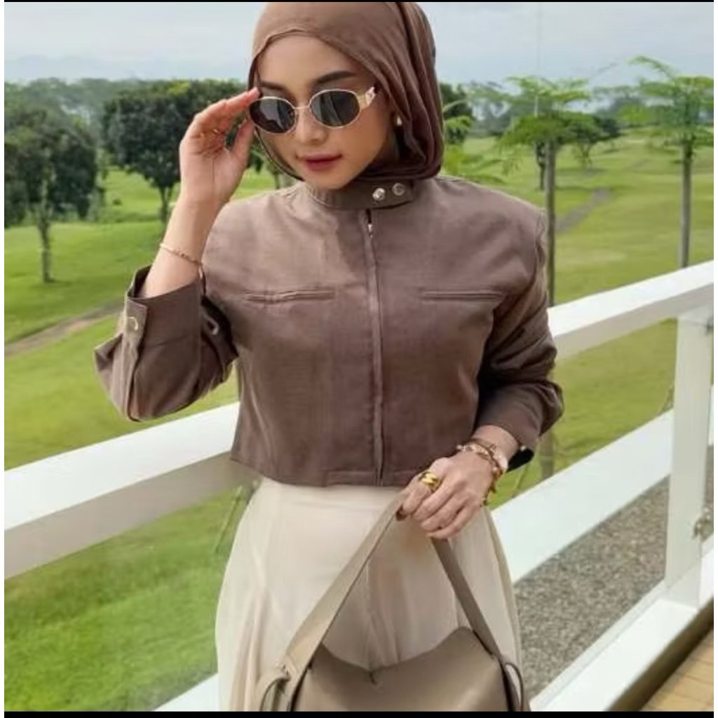 Jacket Crop Wanita Zipper Lengan Panjang Atasan Crop Wanita Bahan Semiwool