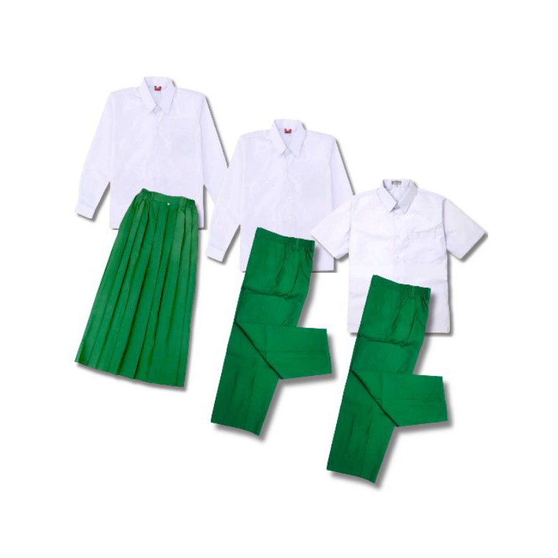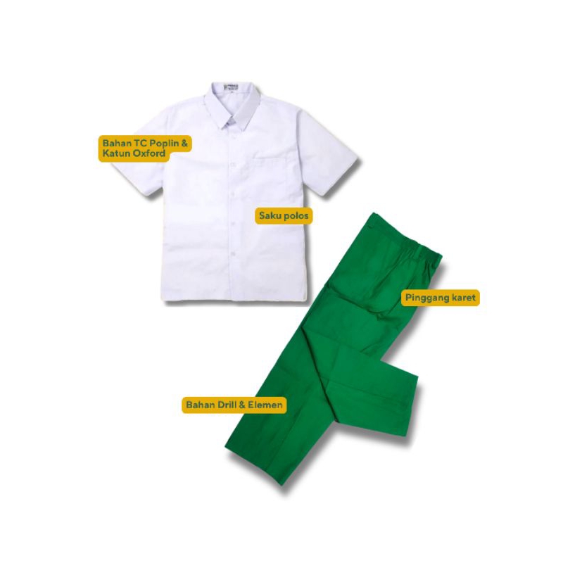 INI SERAGAM - Setelan MI TK Baju Putih los Lengan Panjang Tangan Pendek Celana Panjang Hijau Rok Rempel Plisket Hijau Kemeja Putih los Bawahan Rok Celana Panjang Seragam MI TK
