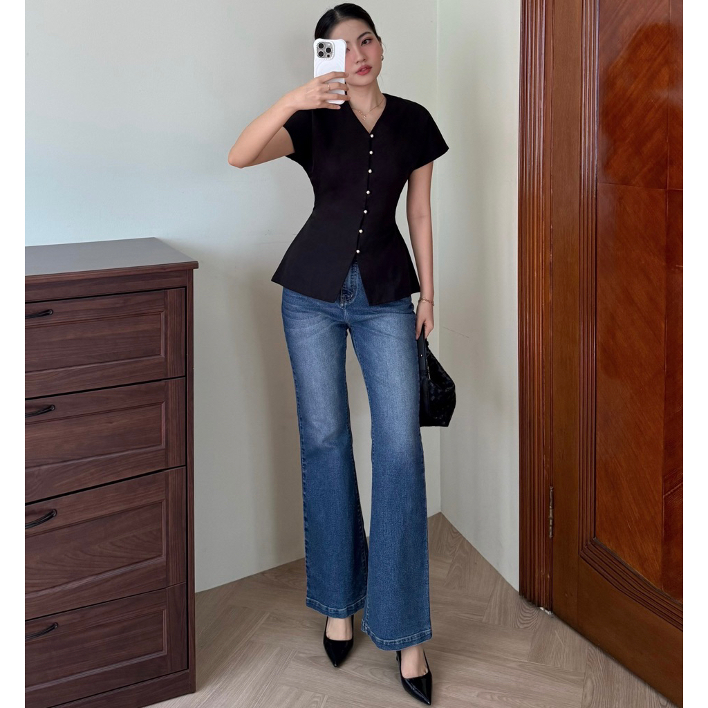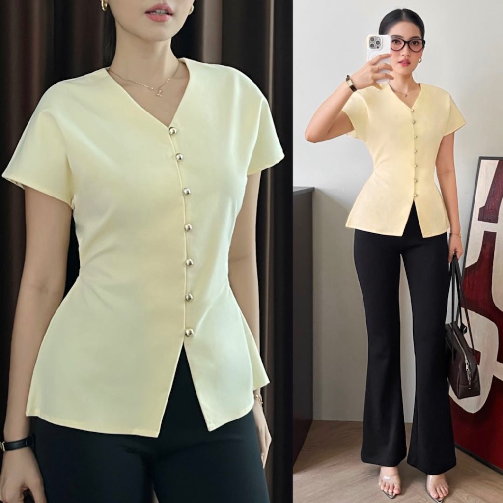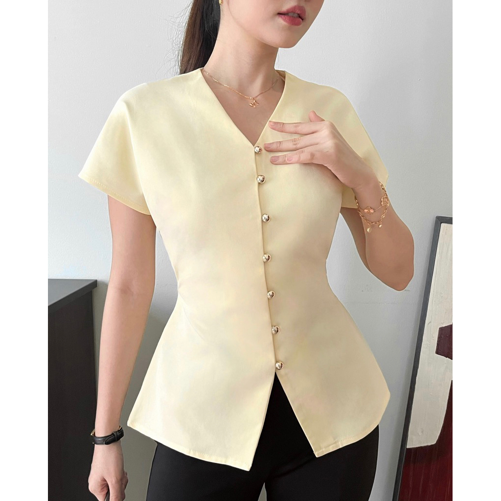 MINA - Rhea kuning mengkilap Button Top - Atasan Wanita Lengan Pendek Semi Fitted Kekinian Kancing kuning mengkilap Leher V-Neck Dengan Tali Adj