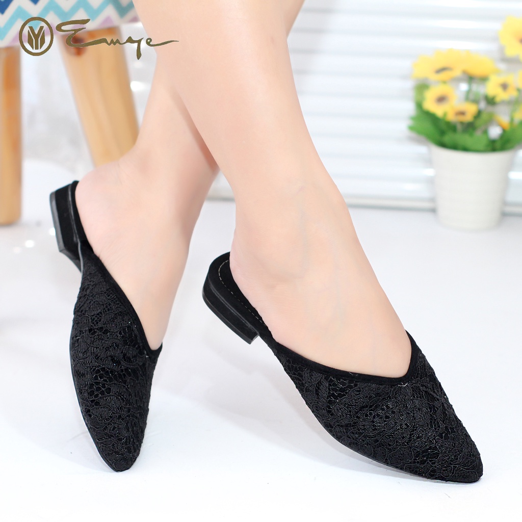 Emye - Sandal Selop Pengantin Flat Brukat Low Heels Mules Wanita Hak 1Cm